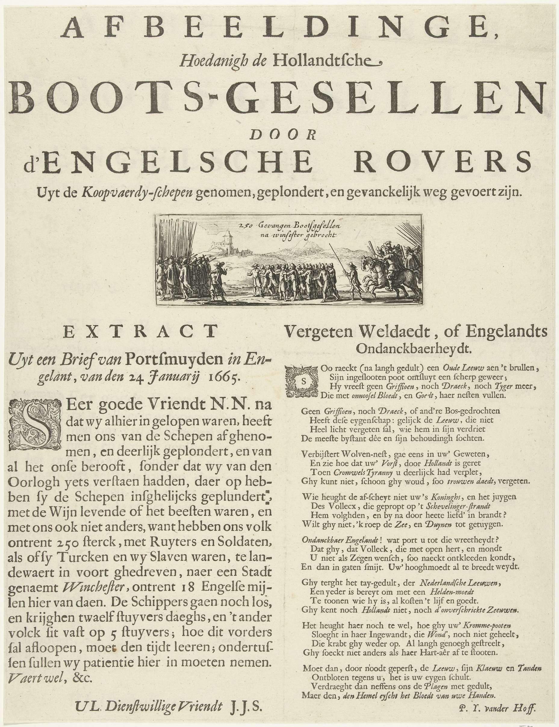 250 Hollandse zeelieden van koopvaardijschepen door de Engelsen beroofd en gevangengenomen, 24 januari 1665. Voorstelling van het wegvoeren naar Winchester van de gevangenen begeleid door soldaten en ruiters. Links een extract uit een brief van een gevangene gestuurd vanuit Portsmouth. Rechts een spotvers op de ondankbaarheid van de Engelsen.