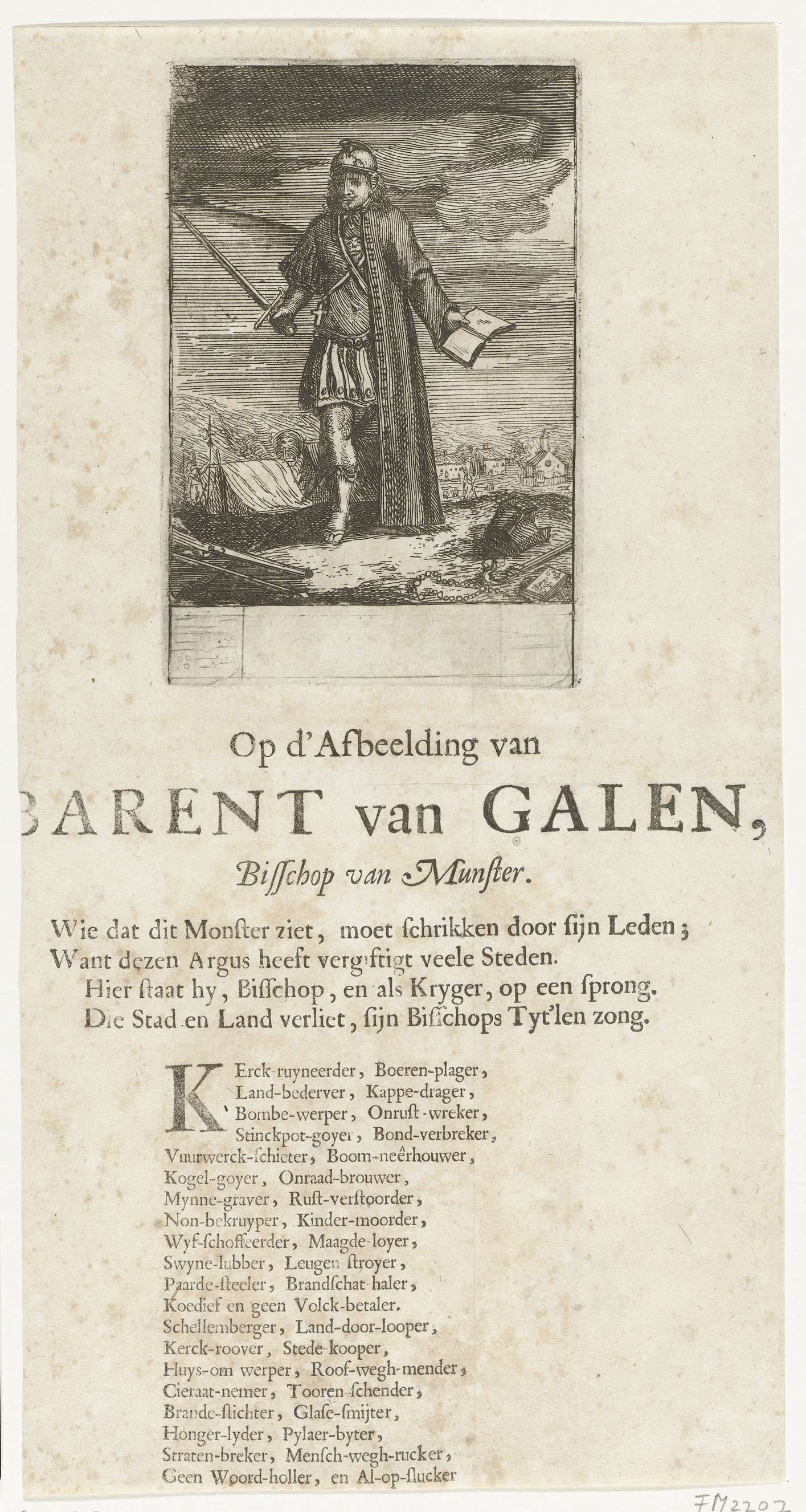Spotprent op Christoph Bernard von Galen, de bisschop van Munster, bij het uitbreken van de Tweede Engelse Oorlog, 1665. De bisschop half gekleed als soldaat en half als bisschop staande met zwaard en boek in de handen. Onder de plaat op het blad gedrukt twee spotverzen op de bisschop.