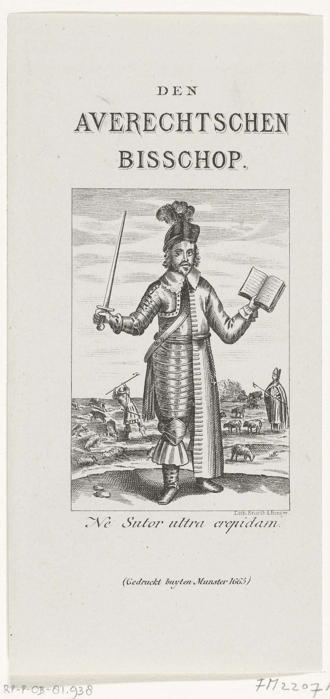 Reproductie van een spotprent op Christoph Bernard von Galen, de bisschop van Munster, bij het uitbreken van de Tweede Engelse Oorlog, 1665. De bisschop half gekleed als soldaat en half als bisschop, staande met zwaard en boek in de handen. Op de achtergrond links doodt de bisschop als soldaat de schapen en rechts als bisschop ...