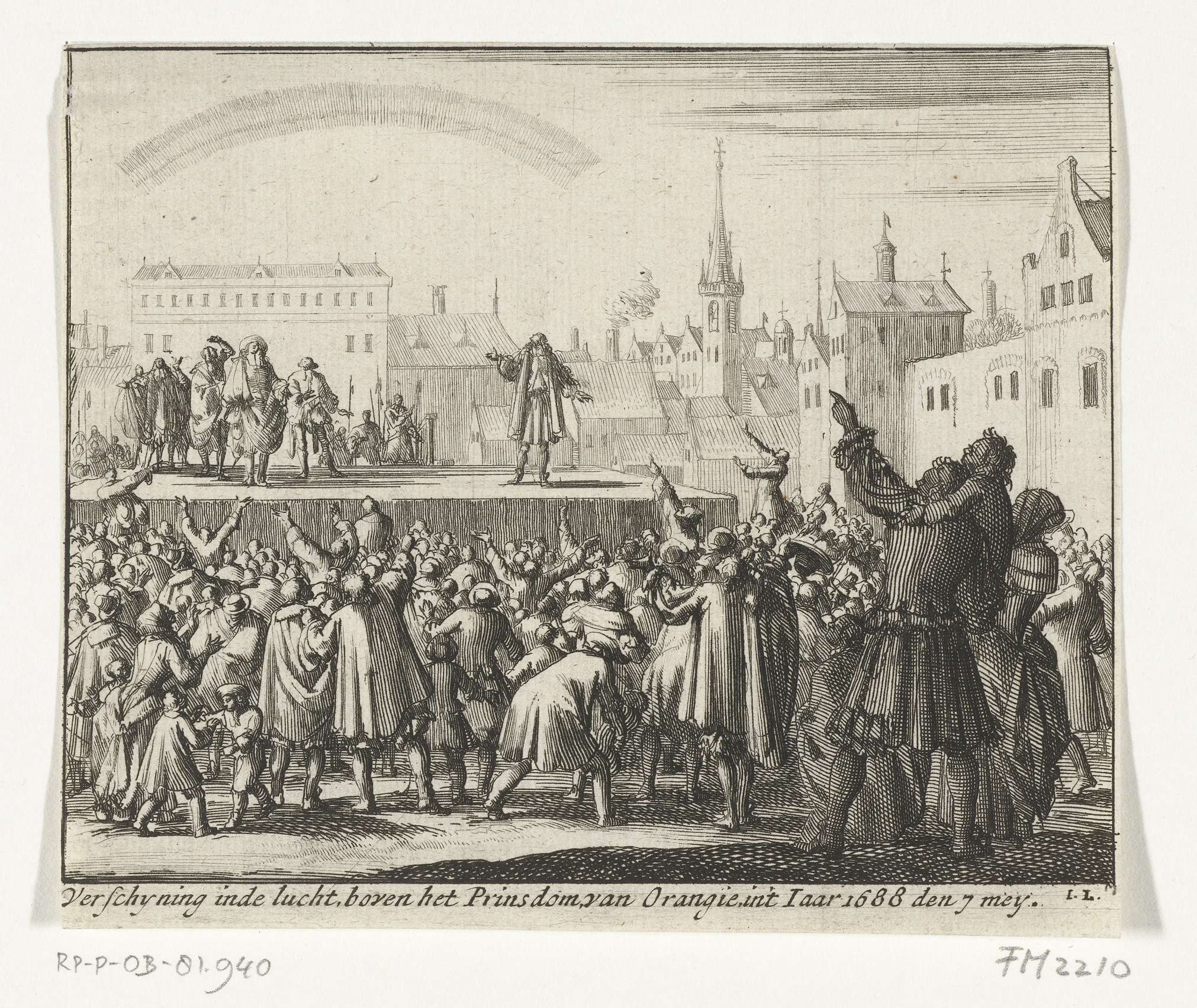 Eed van trouw afgelegd door de steden en de ingezetenen van het vorstendom van Orange aan prins Willem III, 7 mei 1665 (hier ten onrechte geplaatst in het jaar 1688). Ceremonie met de afgevaardigden van de prins en van Orange zittend op een podium opgesteld op een plein te Orange, voor het podium een grote ...