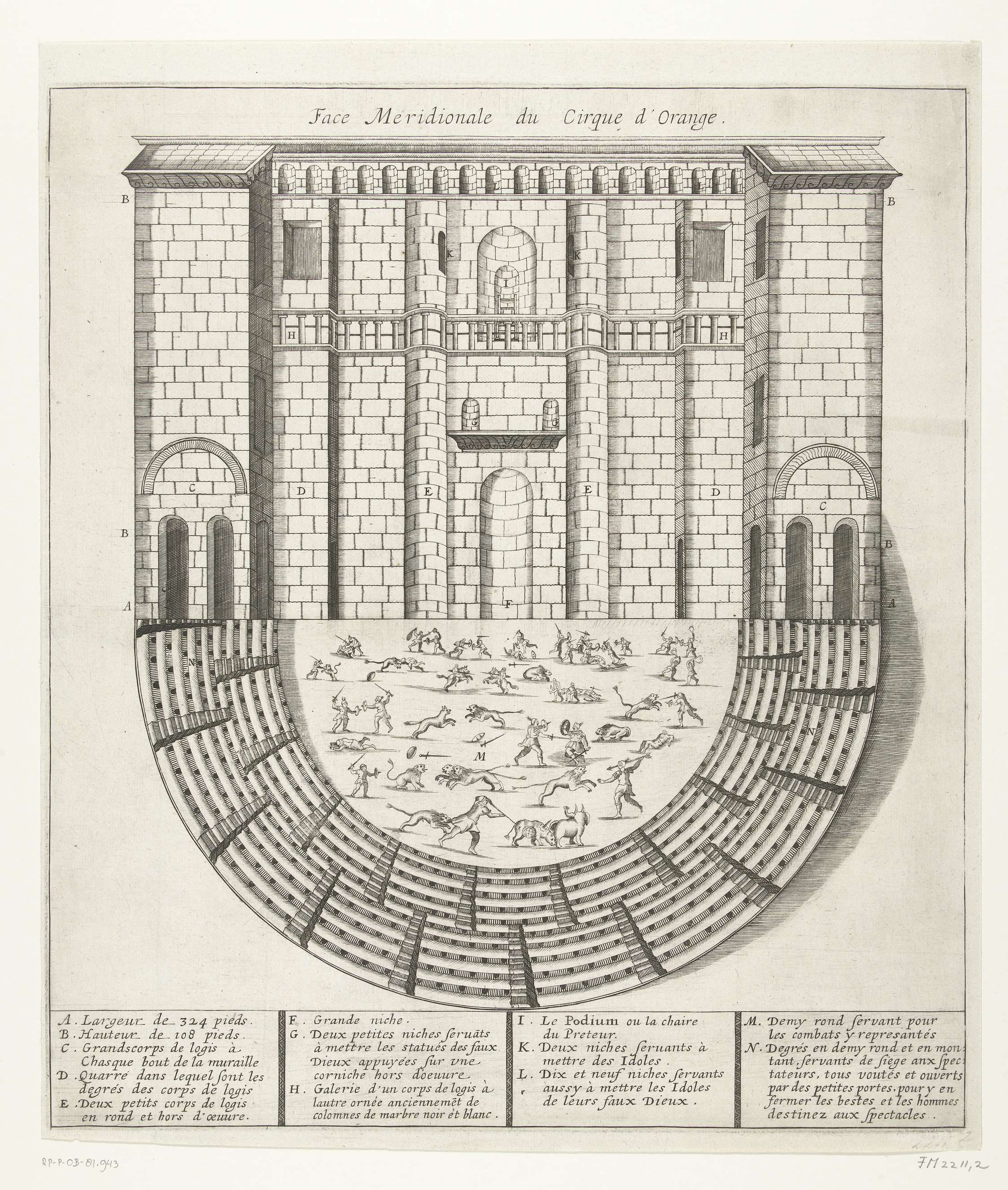 Het Romeinse theater in Orange. Façade en plattegrond, met vechtende gladiatoren. Onderaan de legenda A-N in het Frans.