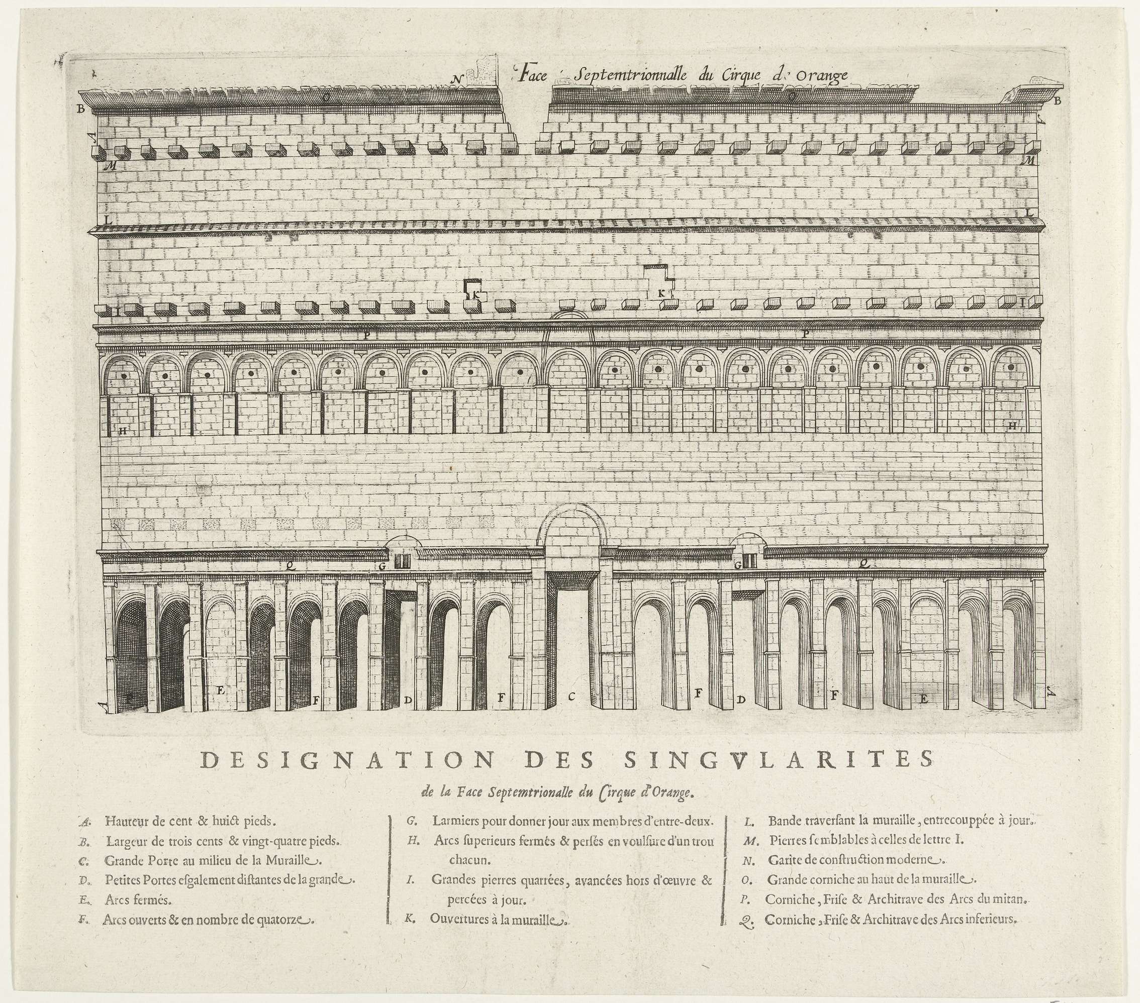 Façade van het Romeinse theater in Orange. Onderaan de legenda A-Q in het Frans.