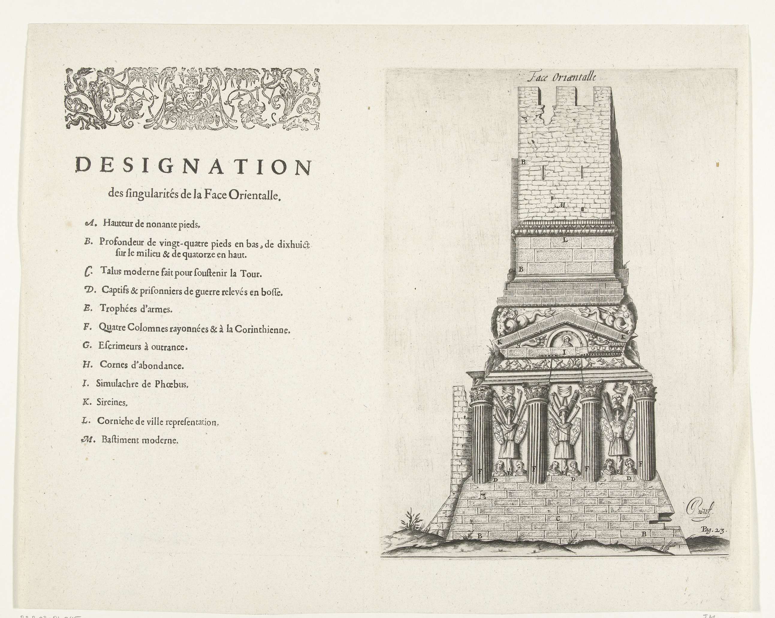 Zijaanzicht van de Romeinse triomfboog in Orange. Links de legenda A-M in het Frans. Gemerkt rechtsonder: Pag.23.