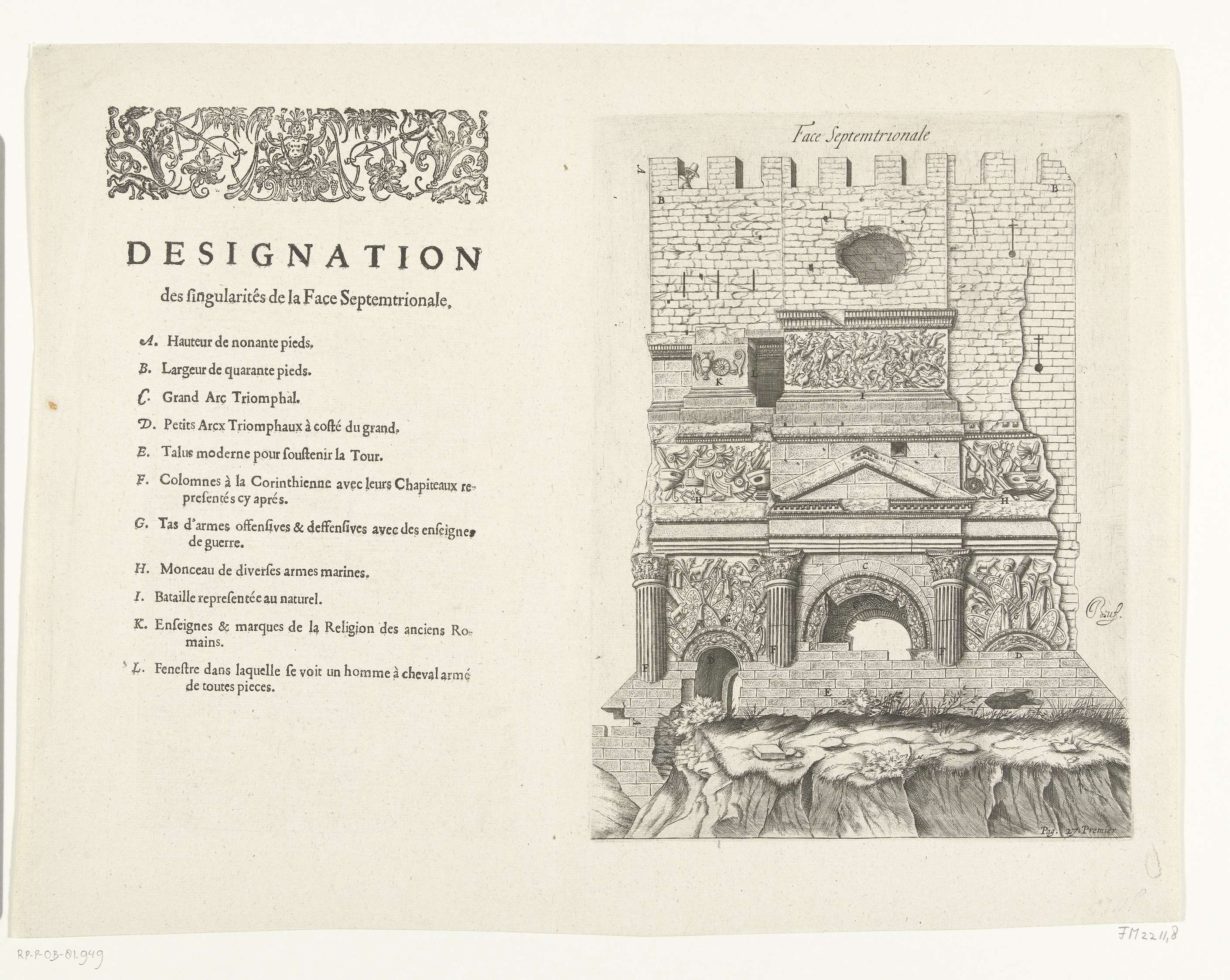Façade van de Romeinse triomfboog in Orange. Links de legenda A-L in het Frans. Gemerkt rechtsonder: Pag. 27. Premier.