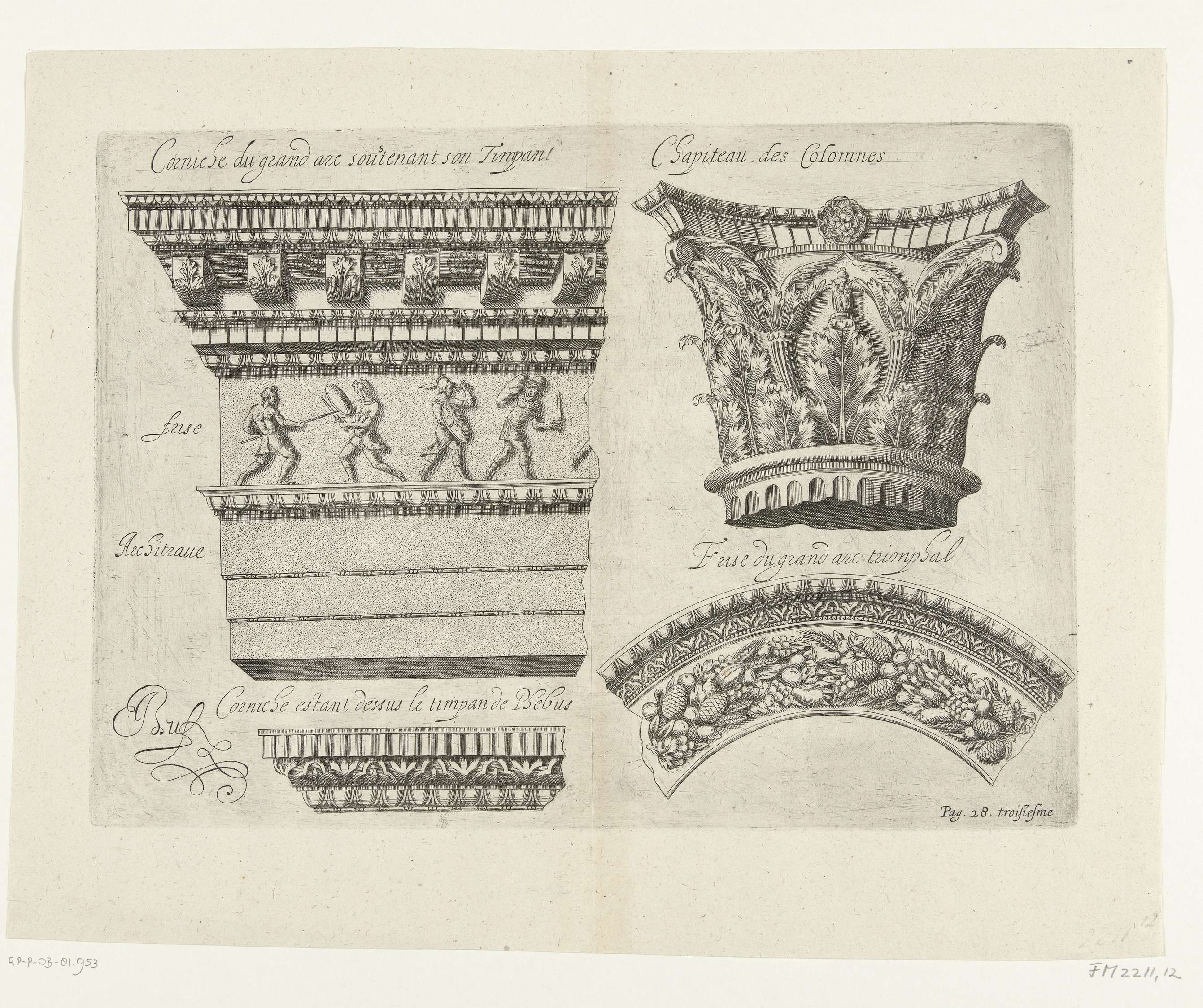 Verschillende friezen en een kapiteel op de Romeinse triomfboog in Orange. Gemerkt rechtsonder: Pag. 28. troisiesme.