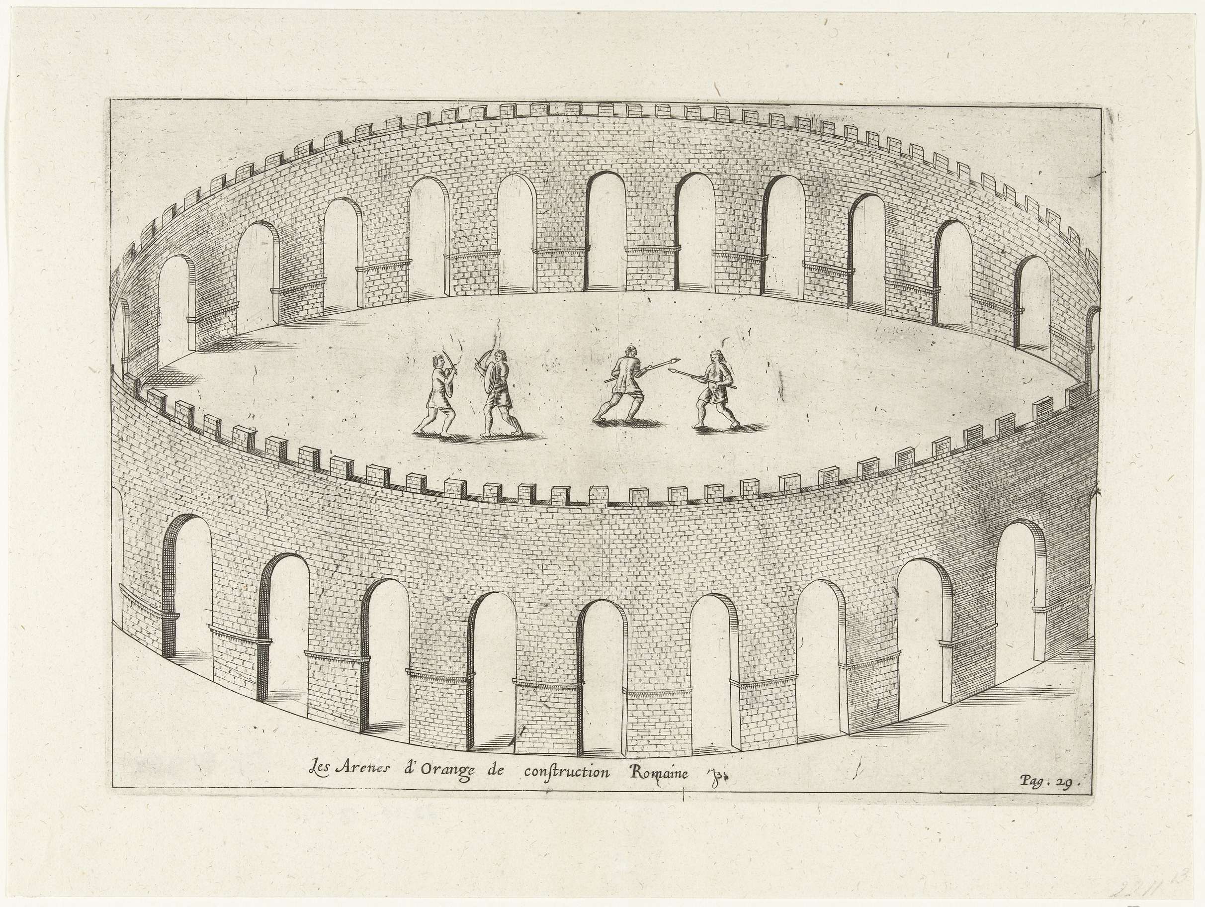 Reconstructie van de Romeinse arena in Orange, met gladiatoren. Gemerkt rechtsonder: Pag. 29.