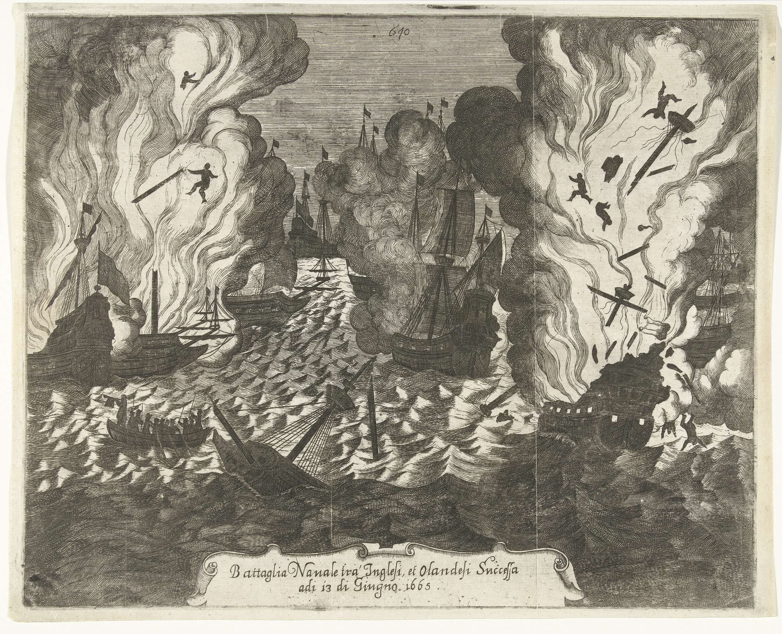 Zeeslag bij Lowestoft waarbij de Engelse vloot onder de hertog van York James Stuart de Staatse vloot onder Jacob van Wassenaer, heer van Obdam, een zware nederlaag toebracht 13 juni 1665. Onderdeel van de Tweede Engelse Oorlog. Met titel in het Italiaans, gemerkt middenboven: 610.