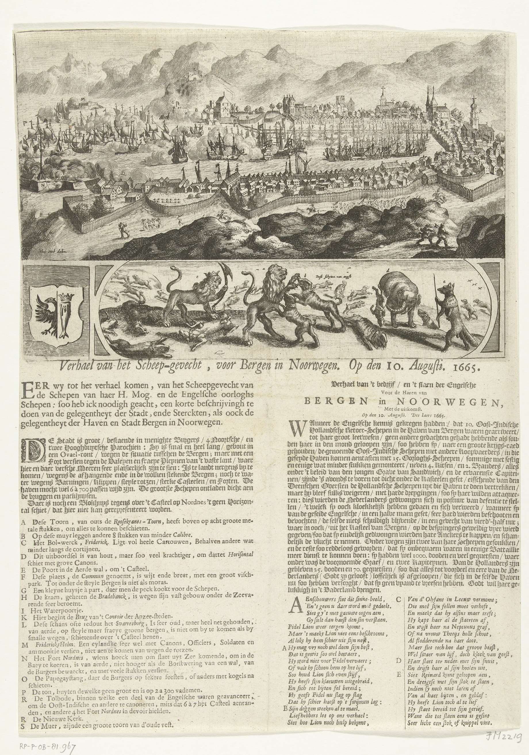 Slag bij Bergen (Noorwegen), 10 augustus 1665. Aanval door de Engelse vloot op de Hollandse koopvaardijvloot gelegen in de neutrale haven van Bergen in Noorwegen. De Engelsen worden door De Ruyter verjaagd. Met een allegorische voorstelling van de strijd verbeeld door dieren: de Nederlandse Leeuw in gevecht met twee Engelse doggen, met links en rechts ...