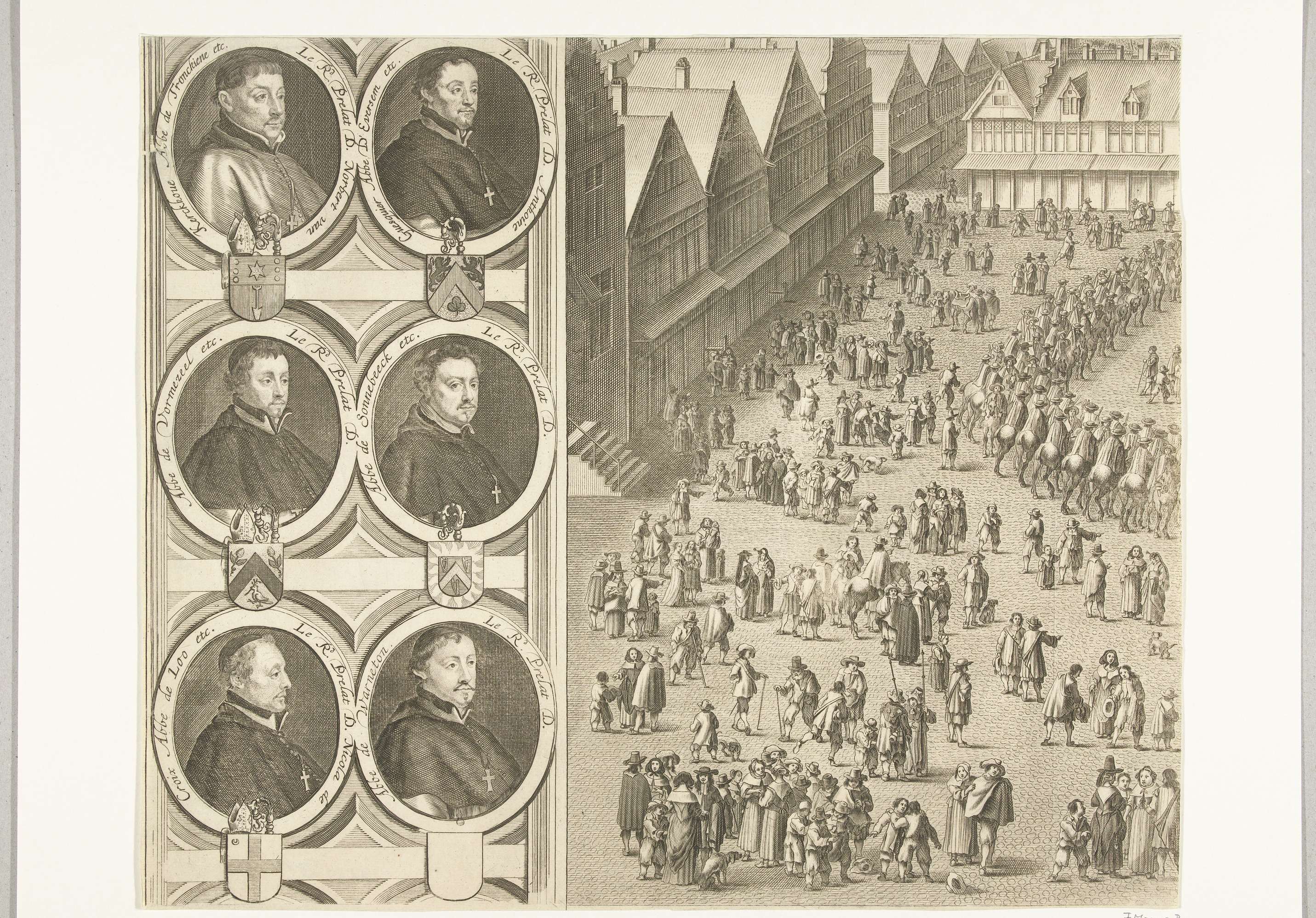 Ceremonie op de Vrijdagmarkt te Gent bij de proclamatie van de Spaanse koning Karel II als graaf van Vlaanderen, 2 mei 1666. Blad 4 in een ongemonteerde ensemble van 12 platen van de ceremonie en cavalcade op het plein en 118 portretten van de hoogwaardigheidsbekleders die bij de plechtigheid aanwezig waren.