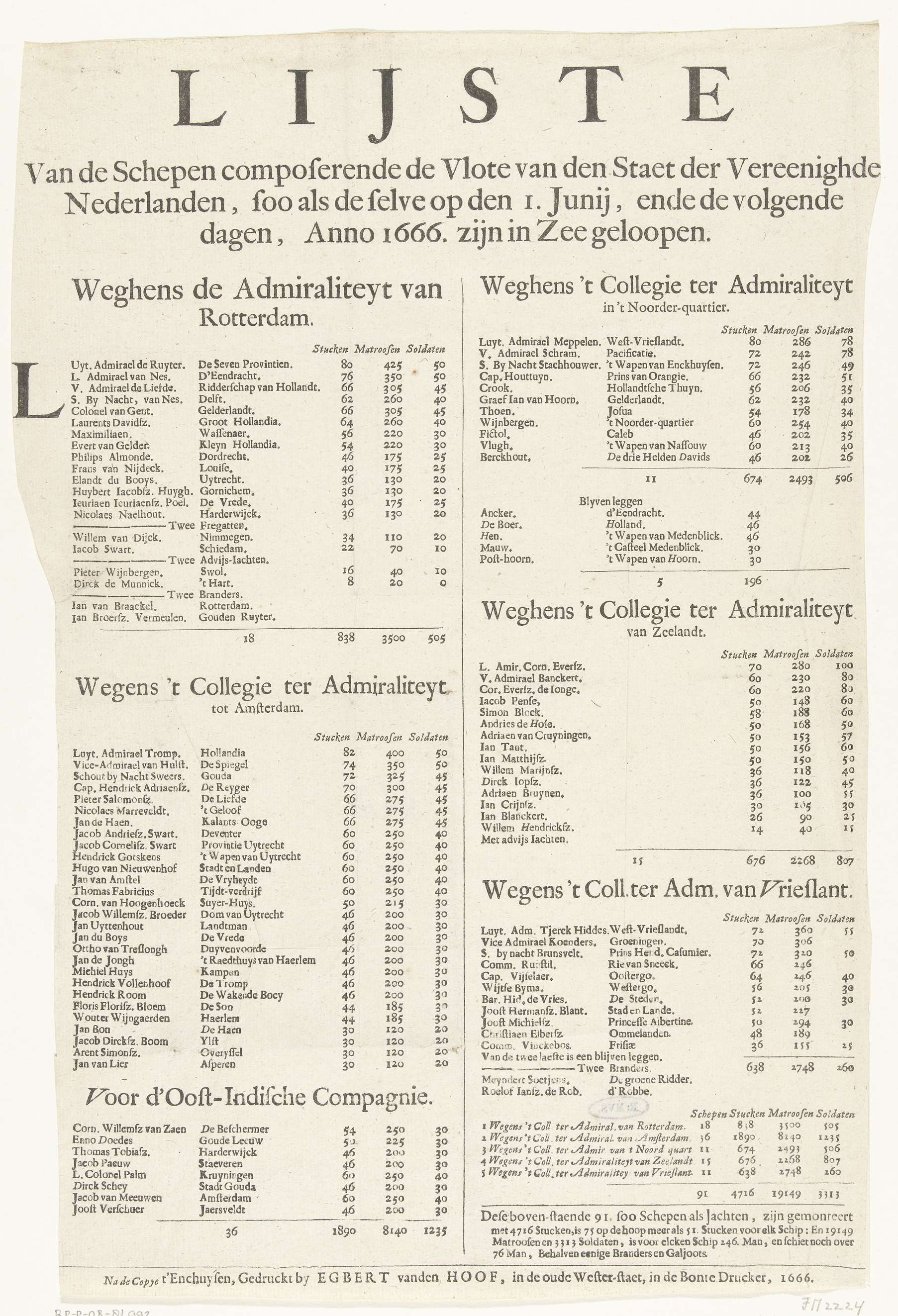 Tekstblad met een lijst van de 91 schepen die op 1 juni 1666 in de Staatse vloot zijn uitgezeild. Lijst in 2 kolommen ingedeeld naar de zes admiraliteiten.
