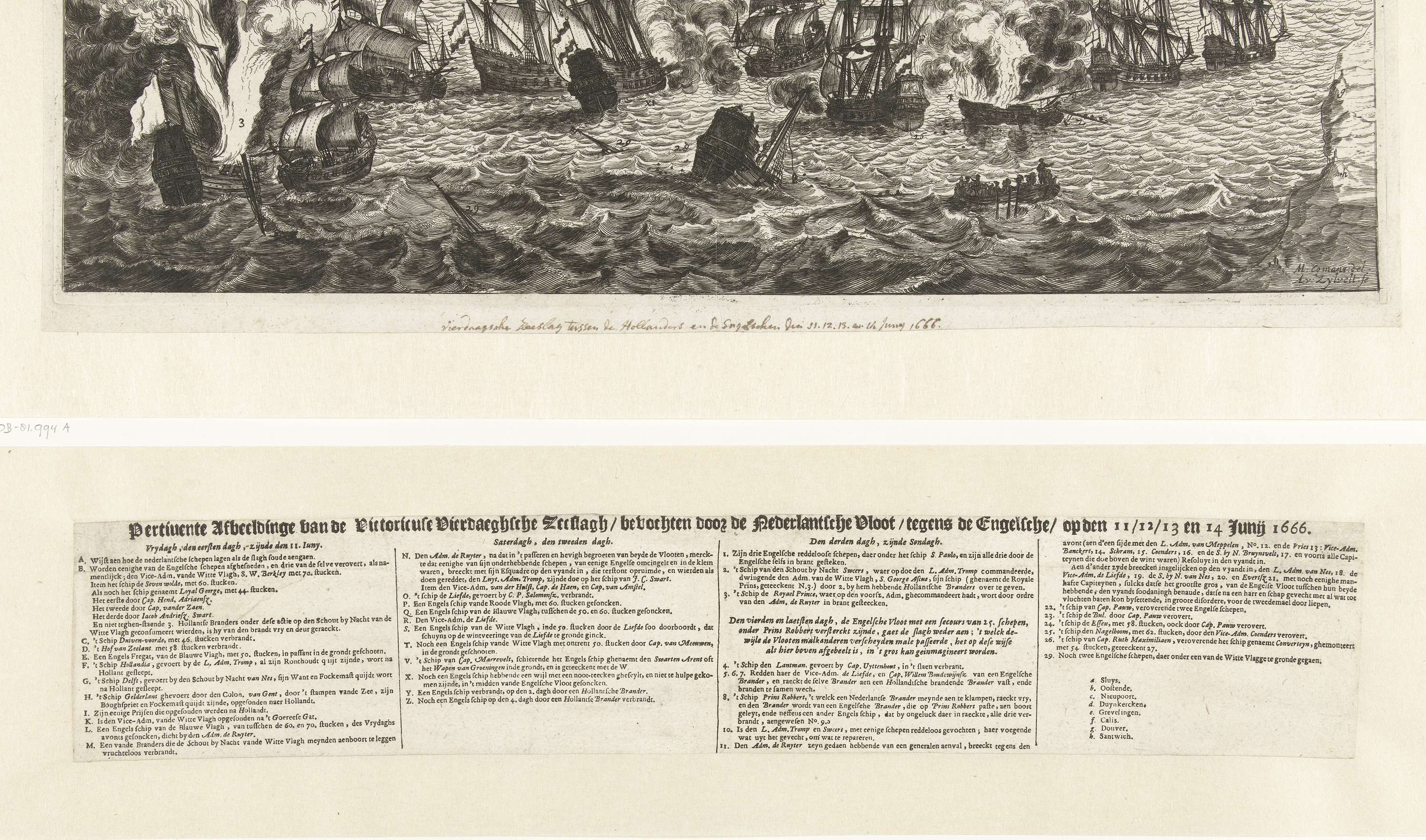 Tekstblad bij de prent van de Vierdaagse Zeeslag tussen de Staatse vloot onder admiraal Michiel Adriaenszoon de Ruyter en de Engelse vloot onder admiraal George Monck, 11-14 juni 1666. Tekst in 4 kolommen met de legenda's A-Z, 1-29 en a-h.