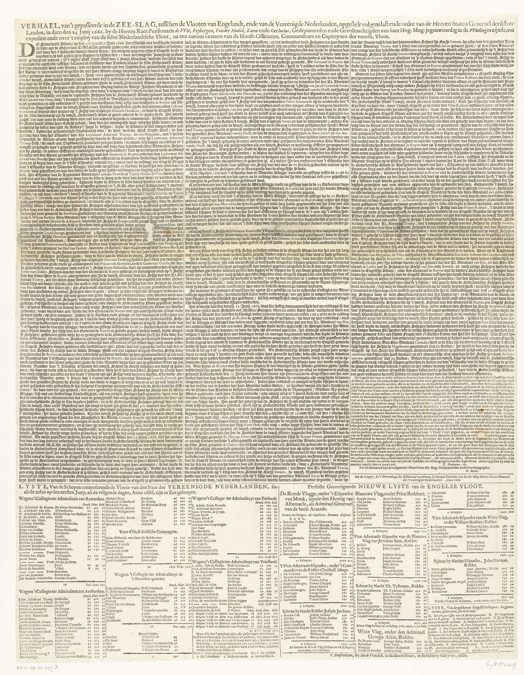Tekstblad bij de prent van de Vierdaagse Zeeslag tussen de Staatse vloot onder admiraal Michiel Adriaenszoon de Ruyter en de Engelse vloot onder admiraal George Monck, 11-14 juni 1666. Verhaal in 3 kolommen, daaronder lijsten van de kapiteins van de Nederlandse en de Engelse schepen die deelnamen aan de slag, de gezonken Nederlandse schepen 1-4 ...