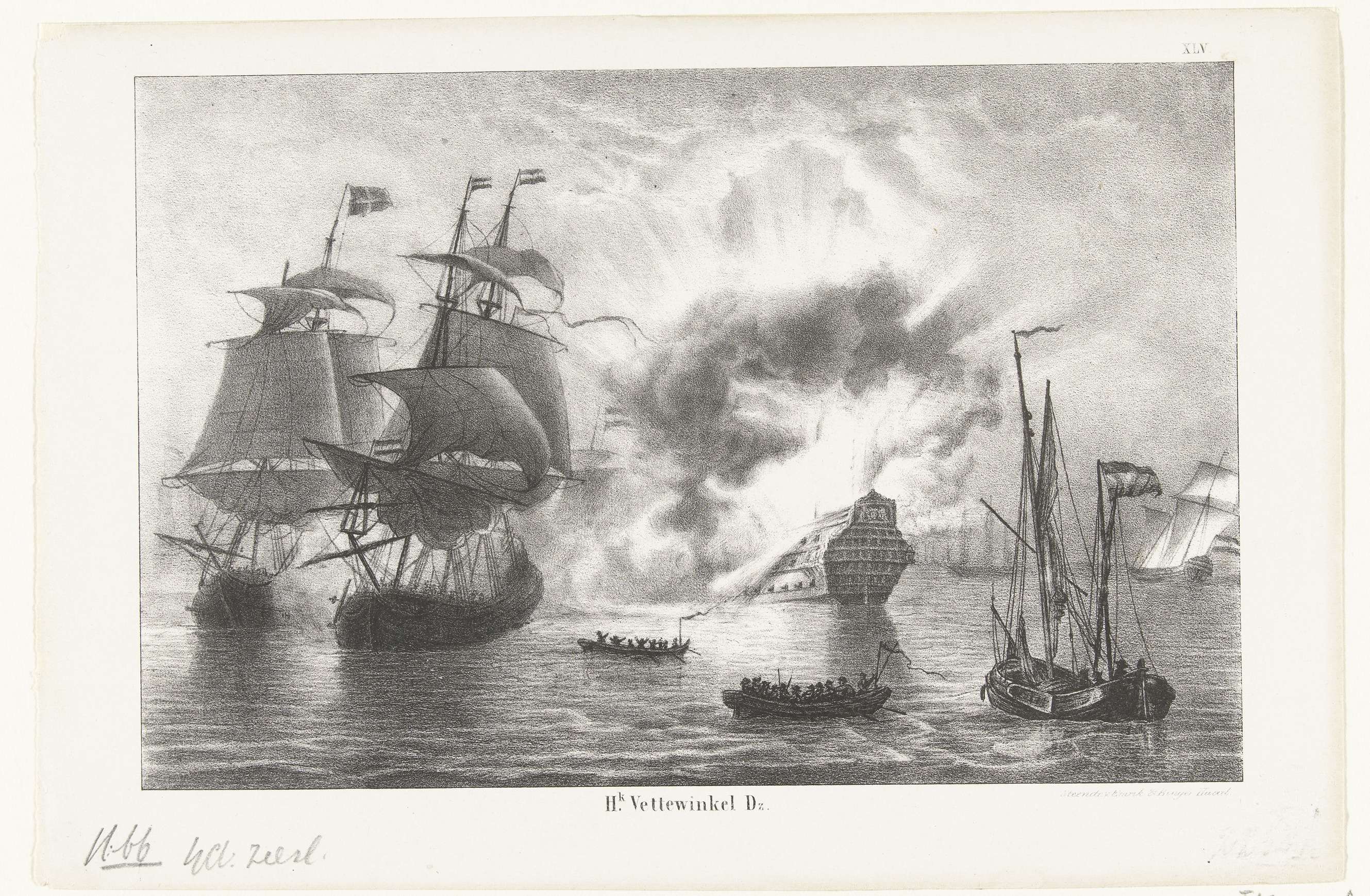 De Vierdaagse Zeeslag tussen de Staatse vloot onder admiraal Michiel Adriaenszoon de Ruyter en de Engelse vloot onder admiraal George Monck, 11-14 juni 1666. In het midden ontploft een schip. Genummerd rechtsboven: XLV.