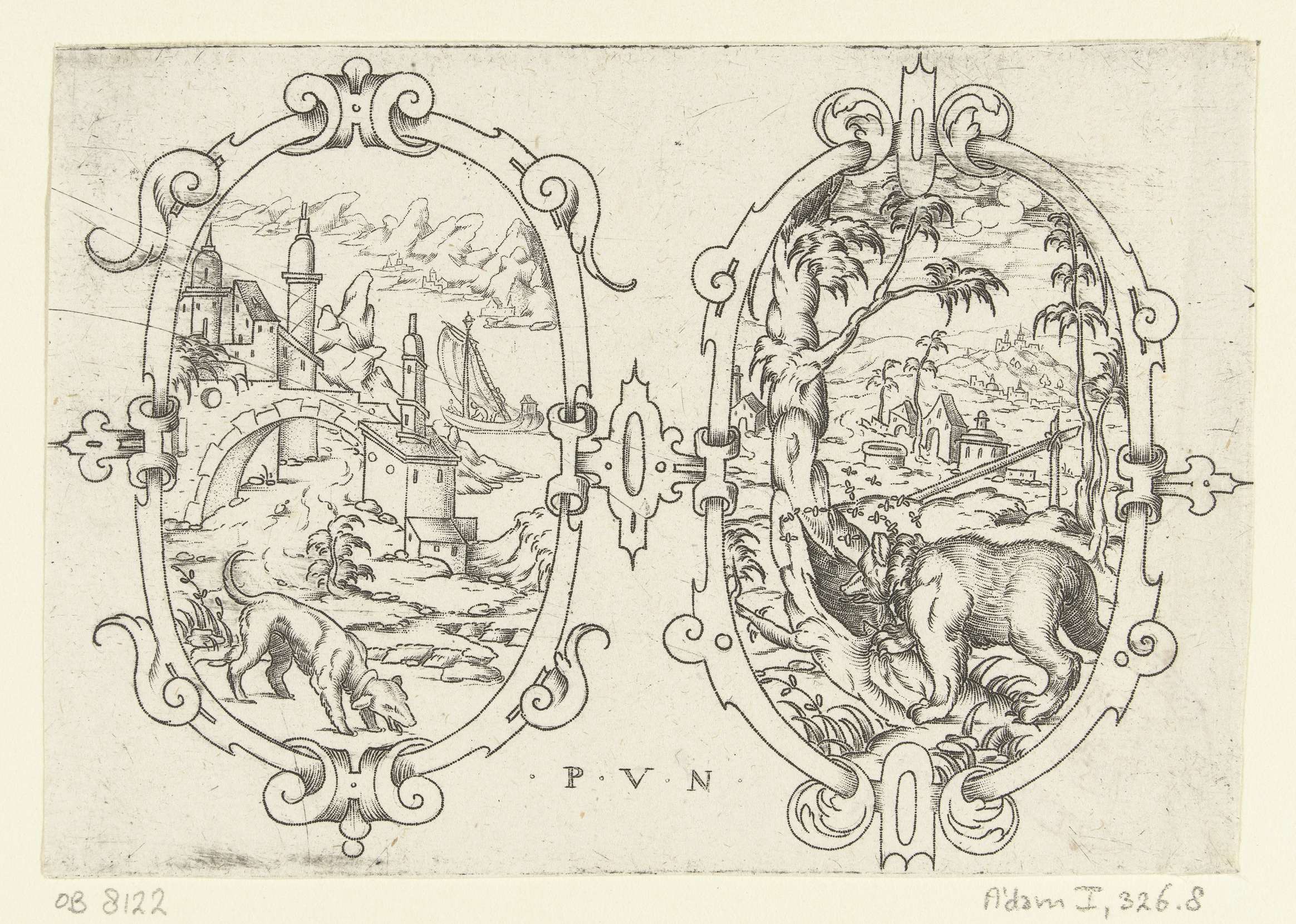 Twee ovalen, links met een hond, rechts met een beer