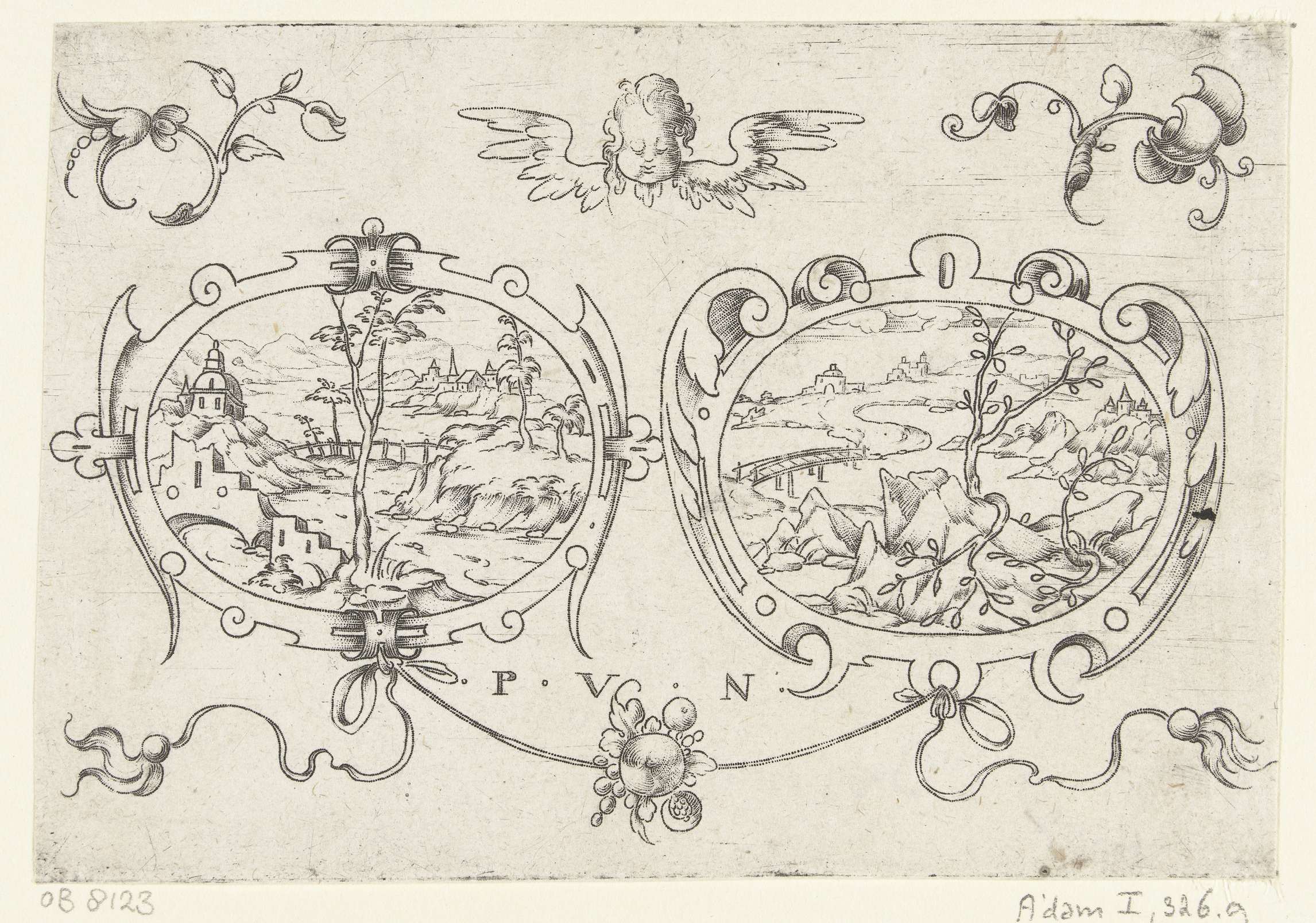 Boven de ovalen bevindt zich een cherubijntje tussen twee bloemen, aan de ovalen hangt een guirlande. Uit serie van 12 bladen.