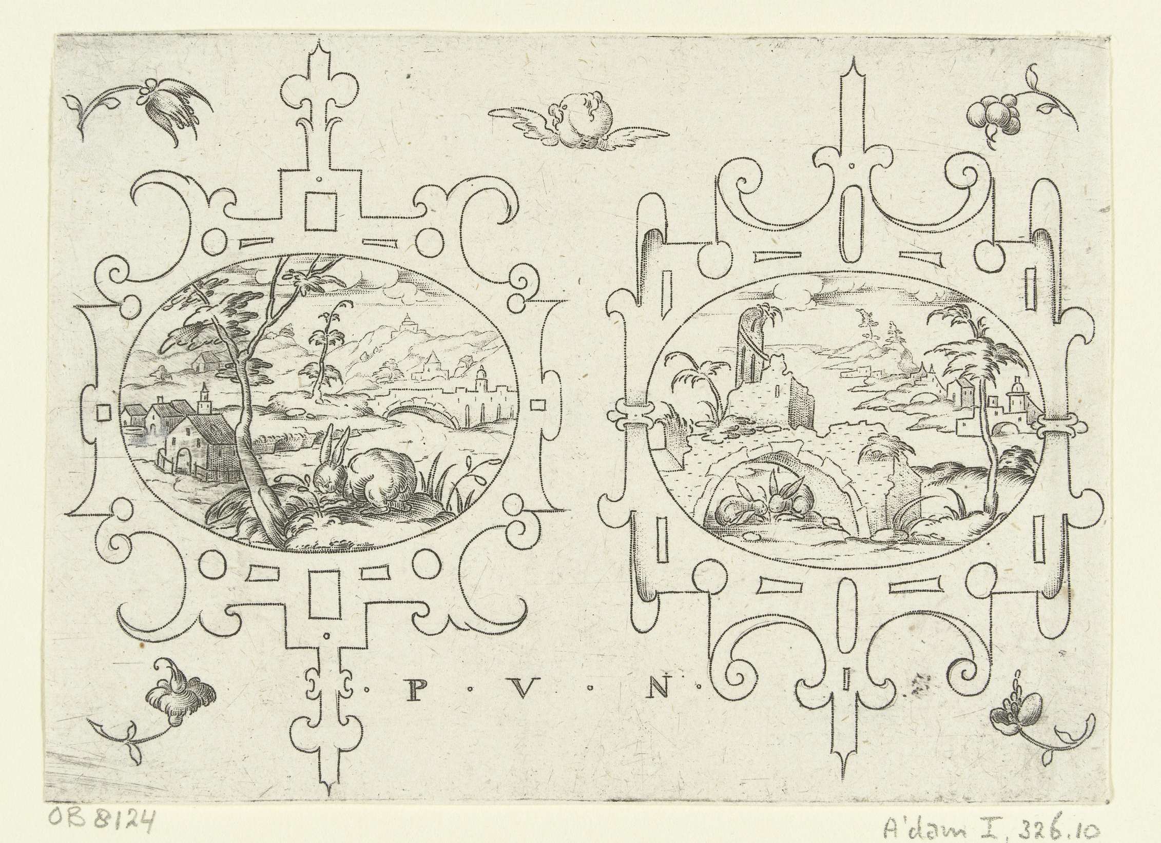 Ovaal links met een konijn, ovaal rechts met konijntjes onder een ruïne. Uit serie van 12 bladen.