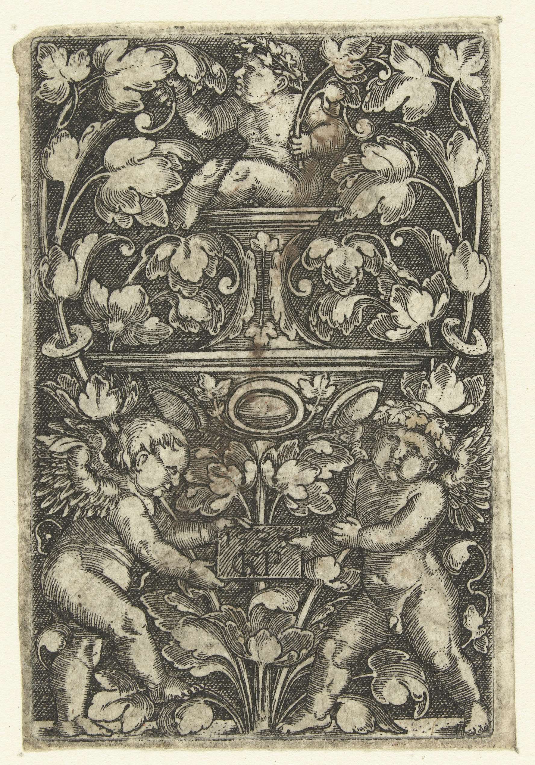 Onderaan staan twee putti die een schildje ophouden. Bovenaan zit een kind met een lauwerkrans om het hoofd op een vaas. Gearceerde achtergrond.