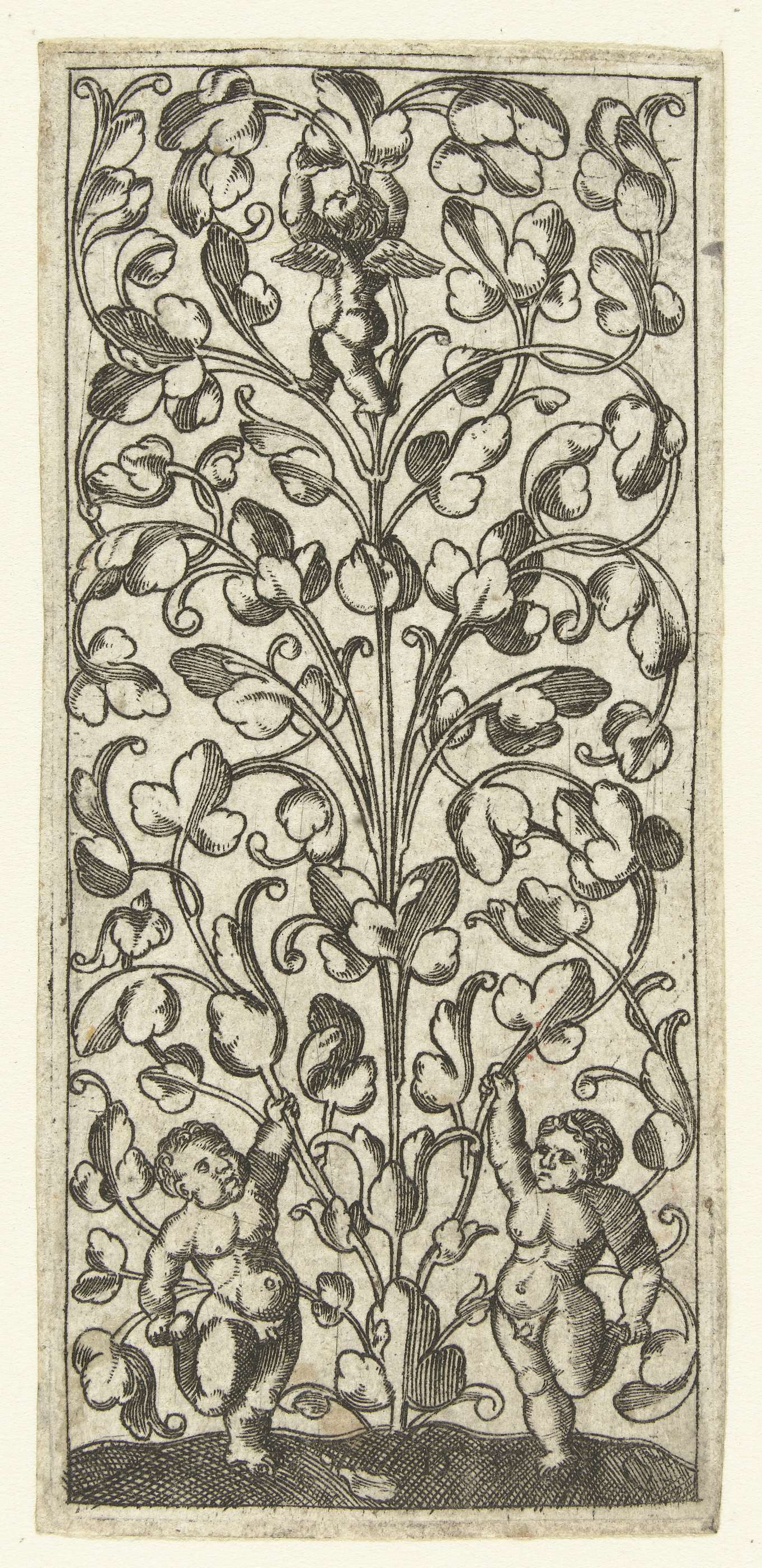 Vlakdecoratie met linksonder en rechtsonder een jongetje dat op één been staat. Middenboven staat een putto in de ranken. Eén van 6 bladen.