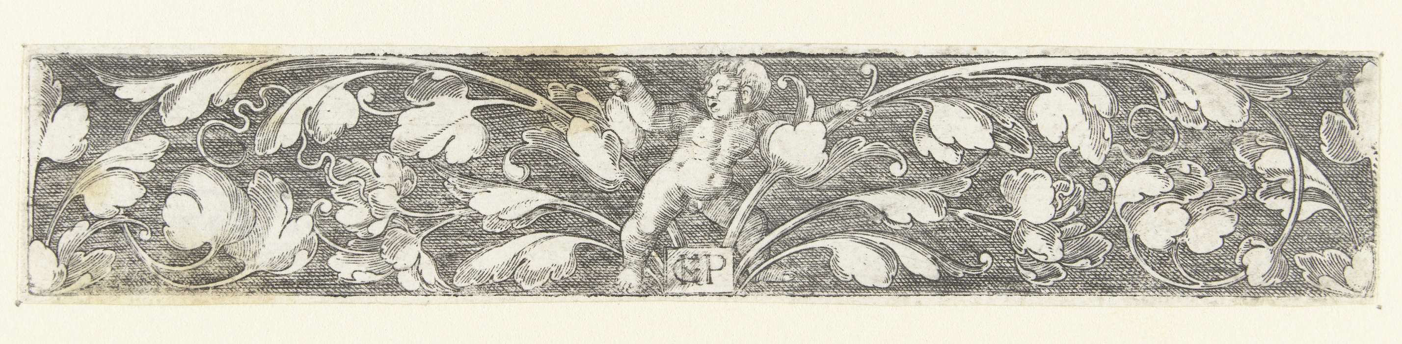 Fries met bladranken ontspruitend vanuit een schildje in het midden