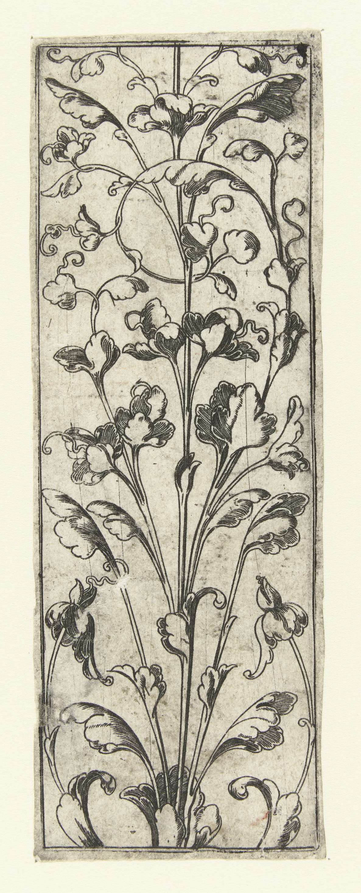 Vlakdecoratie met een stengel, die middenonder samen met kleinere stengels uit een blad ontspruit en die kaarsrecht naar boven steekt. Op circa tweederde van de vlakdecoratie vormt een van de zijscheuten een voluut naar links. Tegenzijdige kopie van prent met objectnummer RP-P-OB-8163.