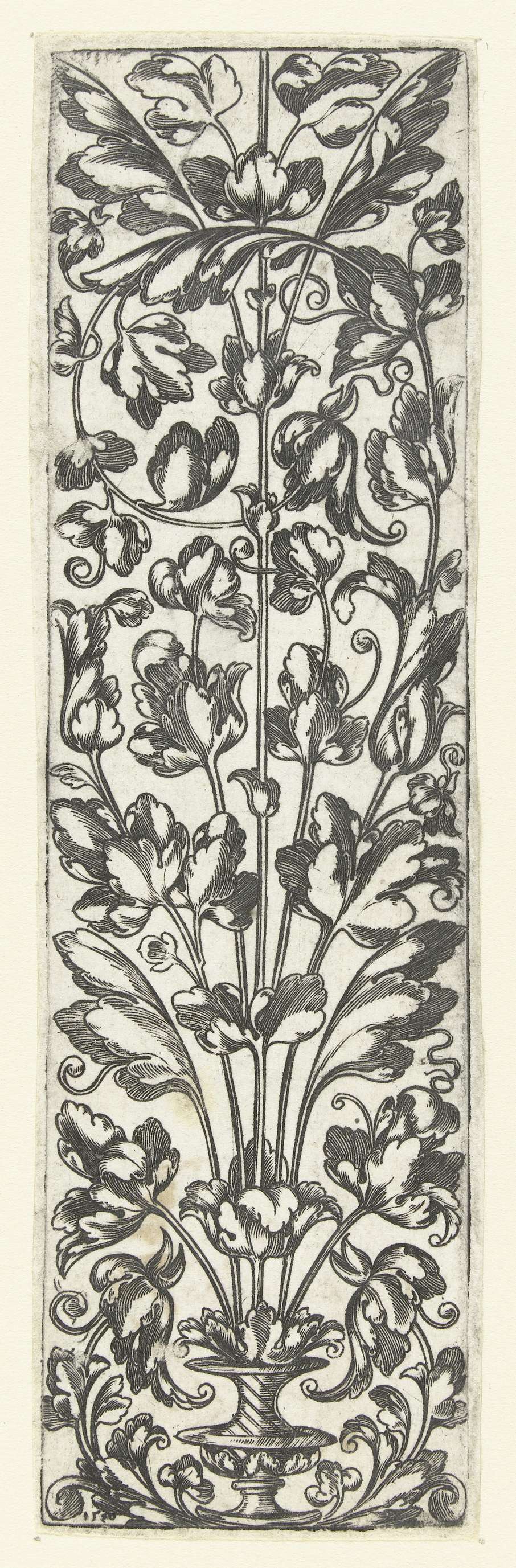 Vlakdecoratie met een stengel, die middenonder samen met kleinere stengels in een vaas staat en die kaarsrecht naarboven steekt. Op circa driekwart van de vlakdecoratie vormt een van de zijscheuten een voluut naar links. Eén van 6 bladen.
