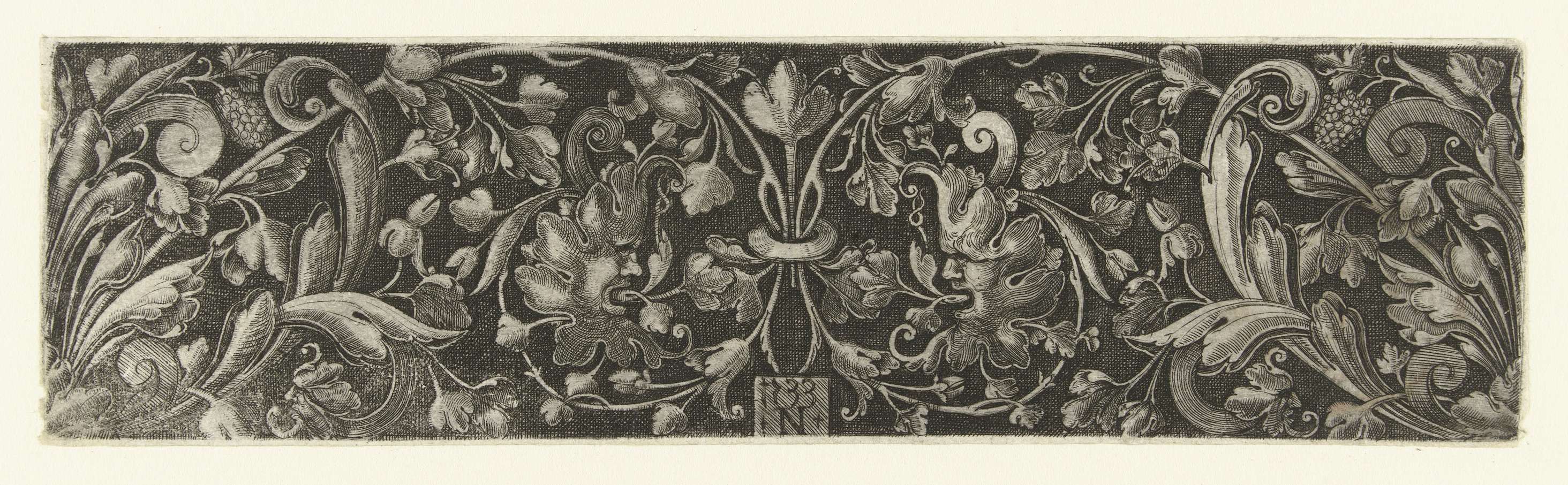 Fries. De voluten komen vanuit de hoeken linksonder en rechtsonder en worden in het midden door een ring bijeen gehouden. Gearceerde achtergrond.