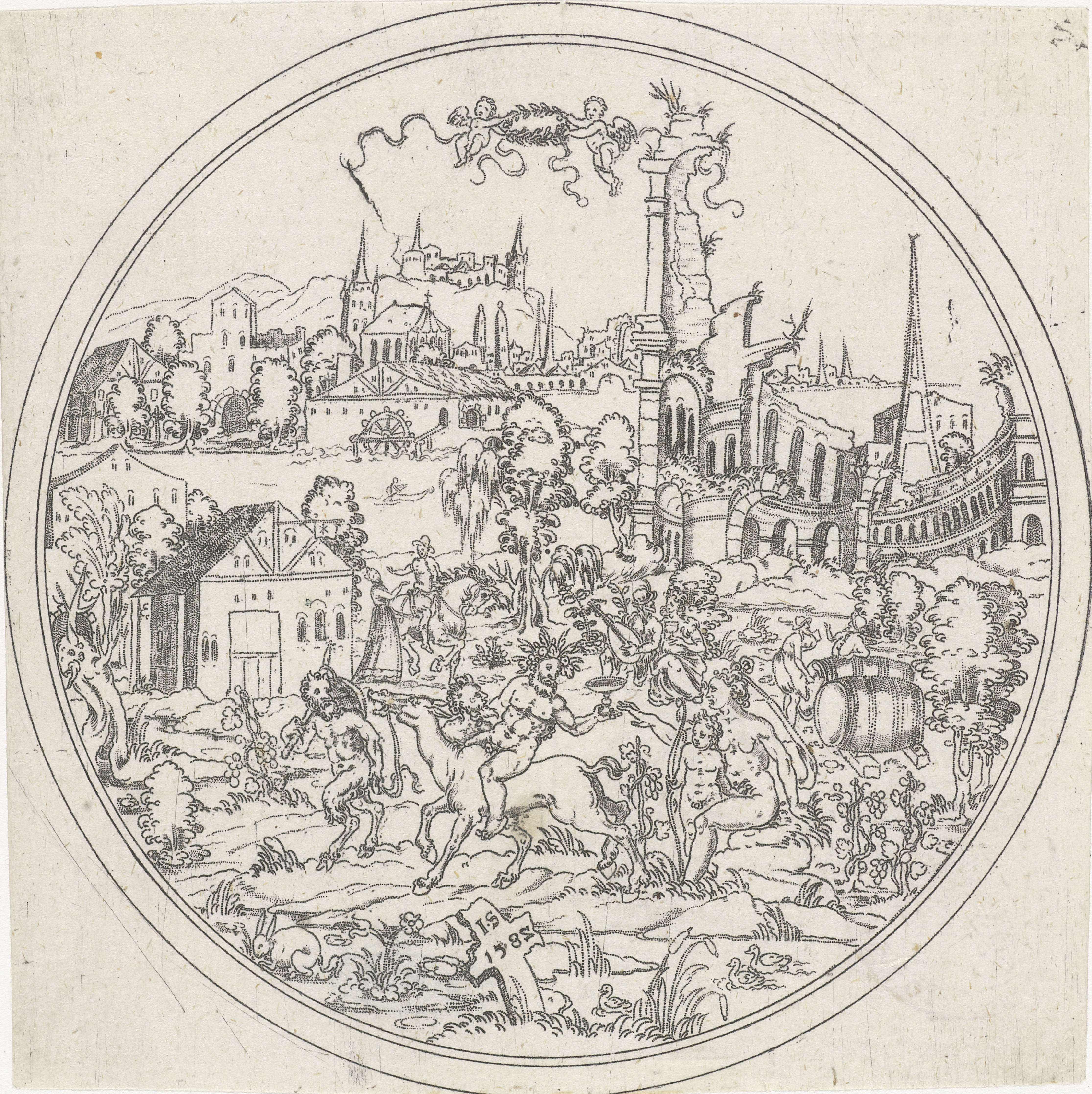 Silenus, rijdend op een ezel en vergezeld door saters. In de lucht zweven twee putti met een lauwerkrans. Uit serie van 8 bladen?