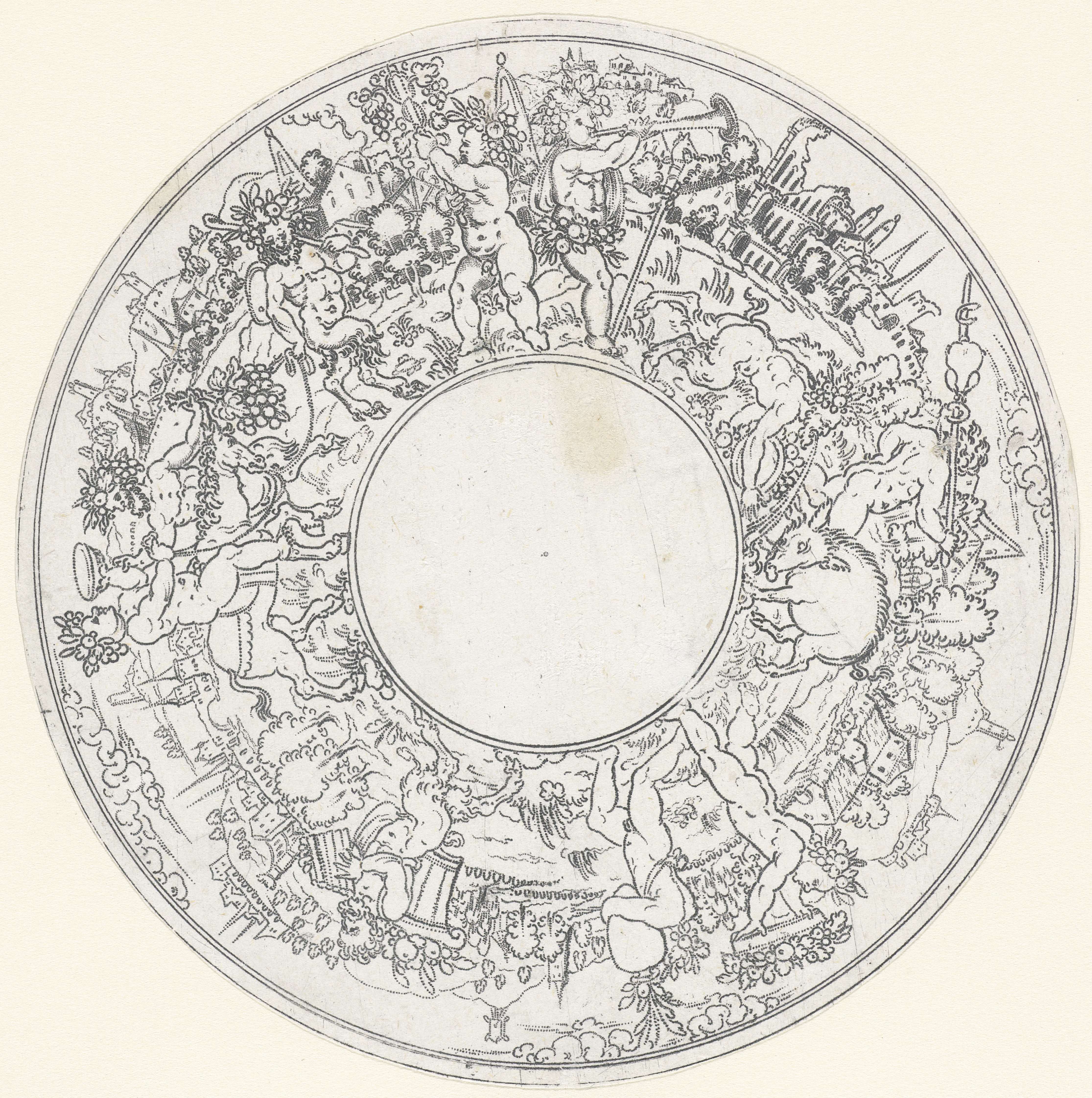 Achter Bacchus lopen saters en kinderen met vruchten en muziekinstrumenten. Eén van 2 bladen.
