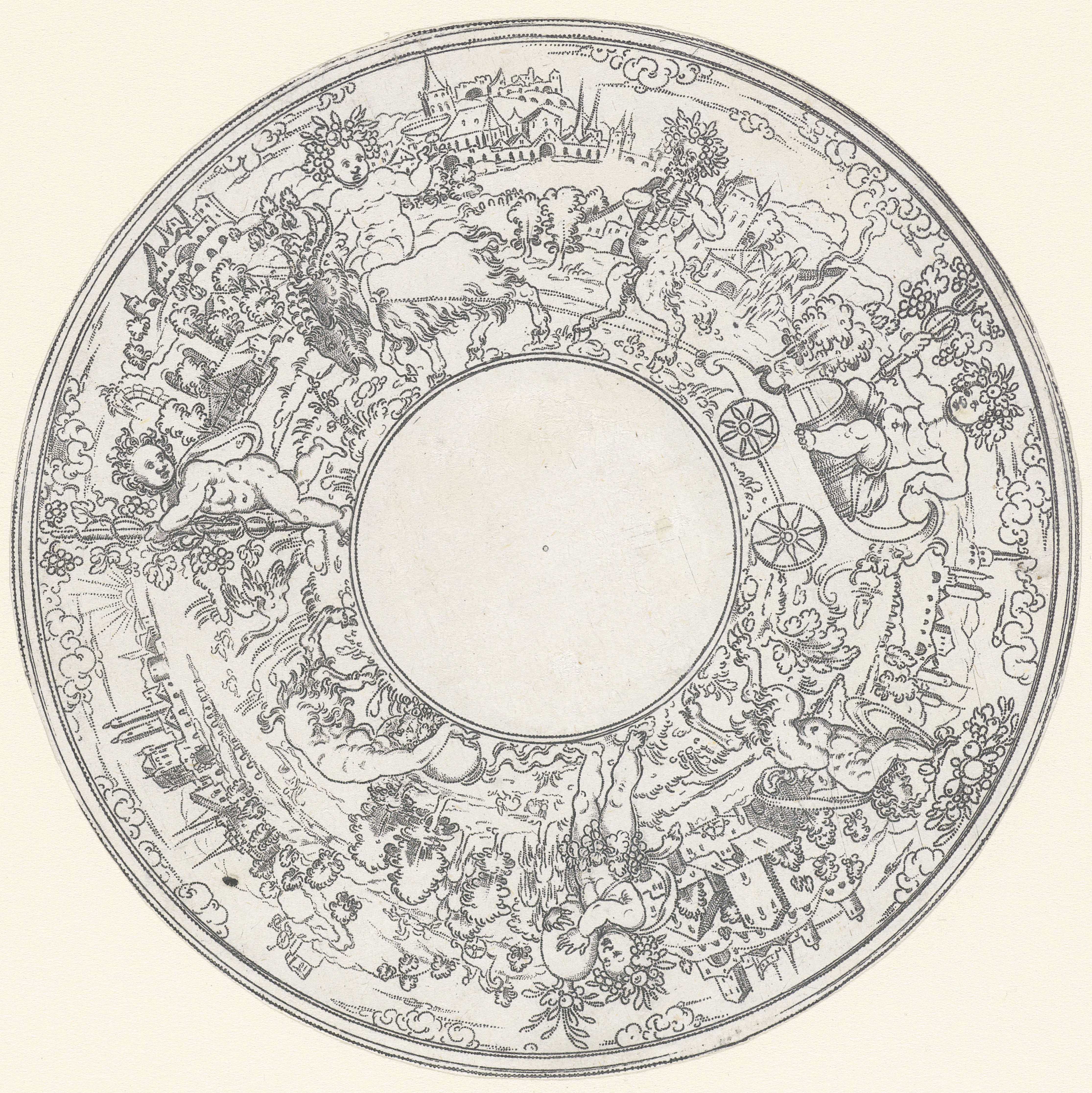 Bacchus wordt begeleid door saters en kinderen met druiventrossen. Eén van 2 bladen.