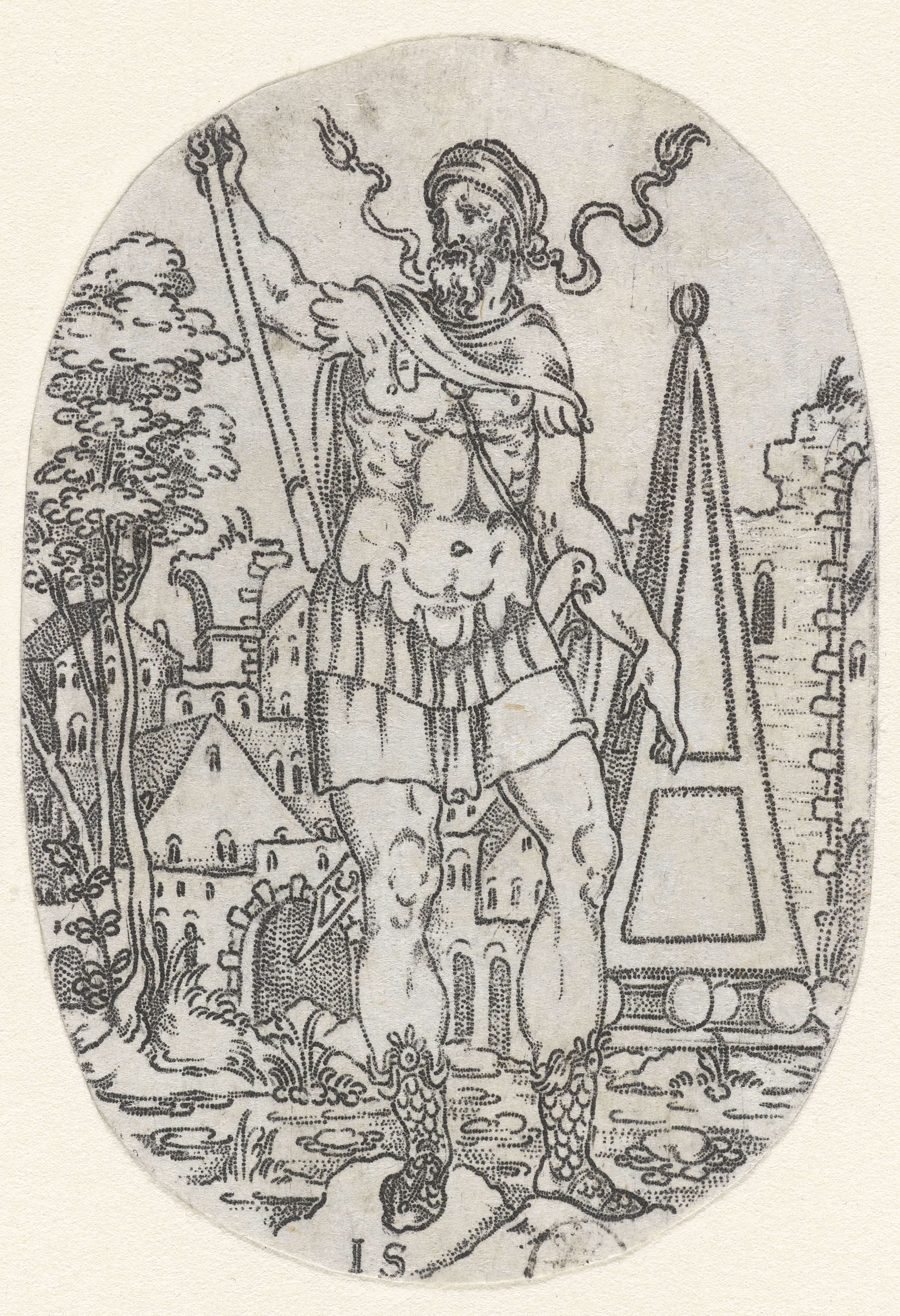 Man met een wapenrok bij een obelisk