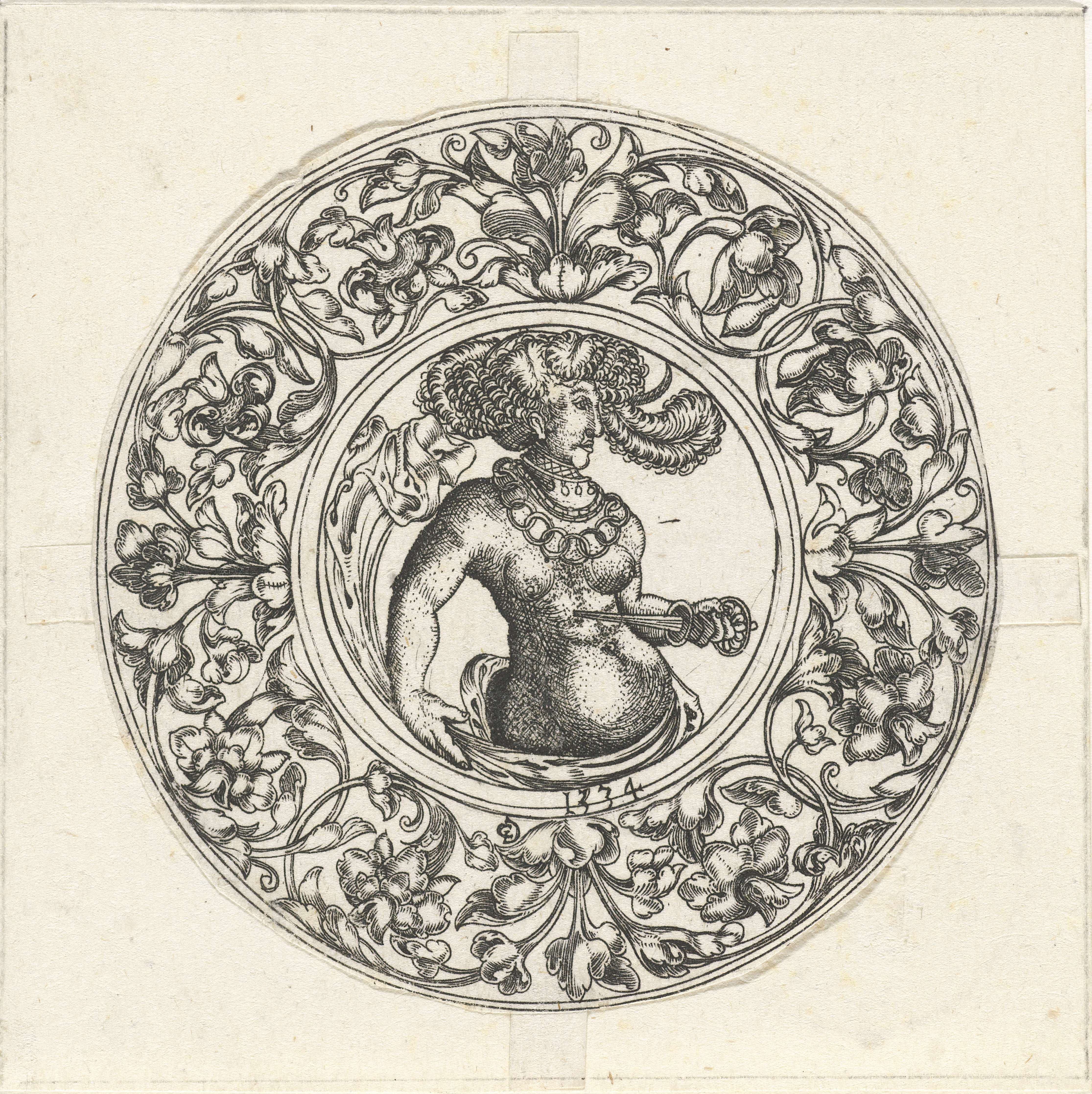 Lucretia is getooid met een hoed met veren. Rondom haar een rand met bladranken.