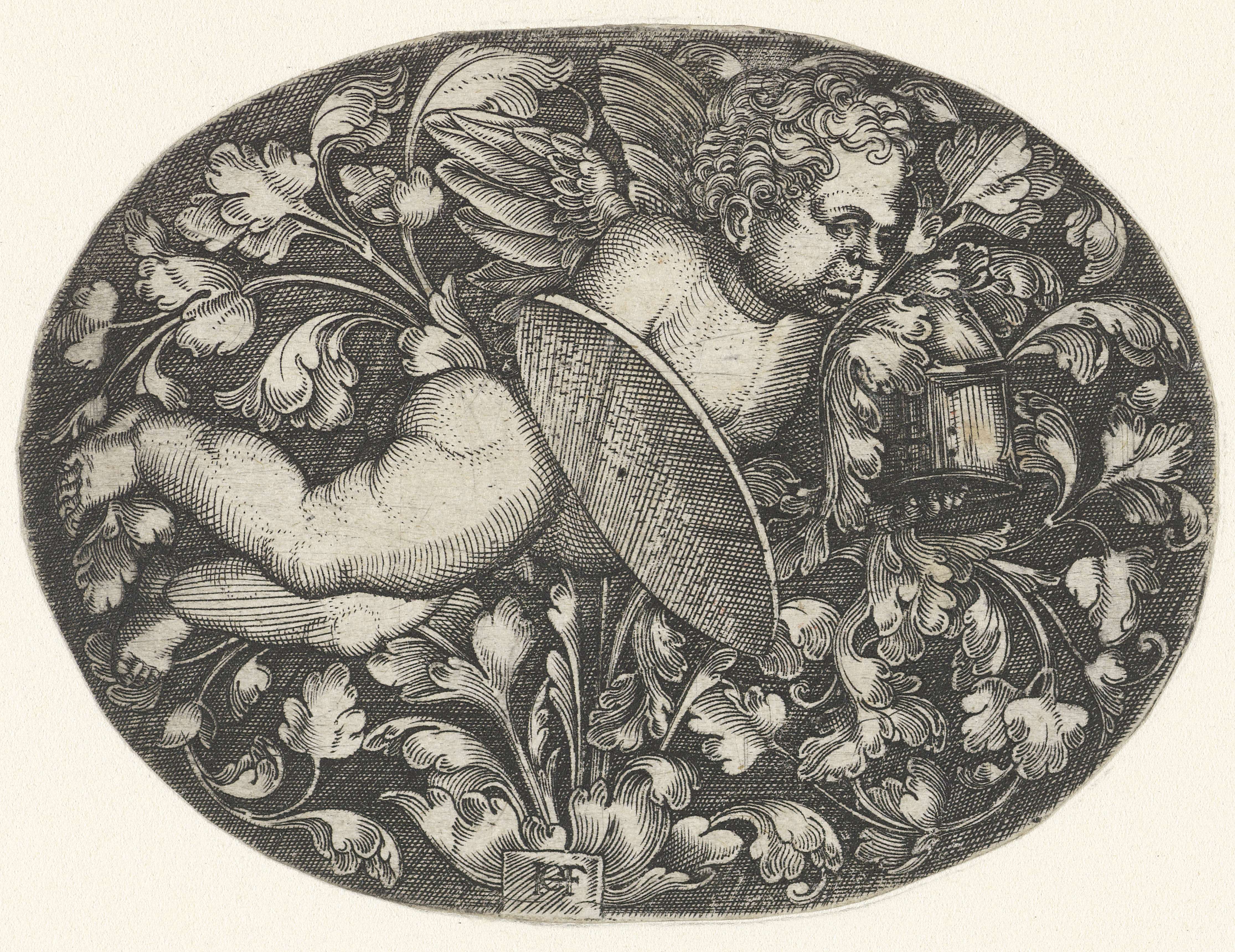 Ovaal. De putto heeft een schild in zijn ene hand en een helm in de andere. Gearceerde achtergrond.