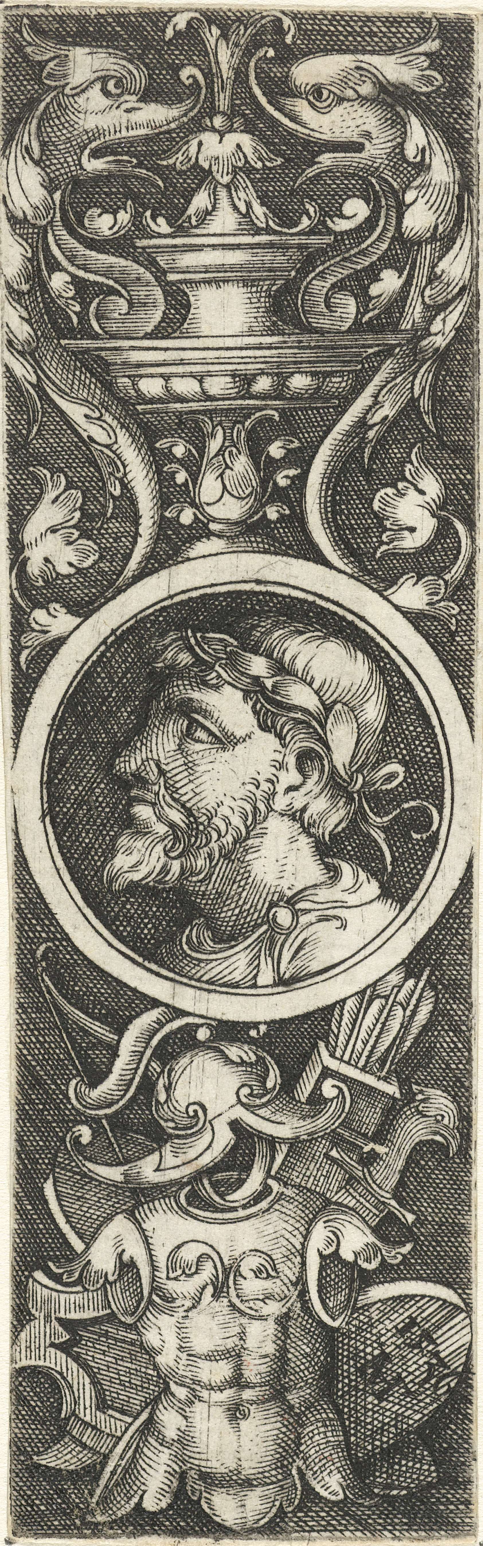 Bovenaan staat een vaas tussen twee dolfijnen. Gearceerde achtergrond.