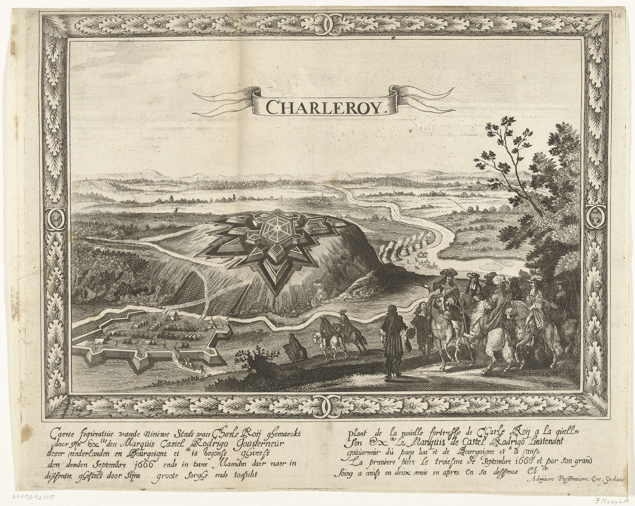 De nieuwe vesting van Charleroi waarvoor de eerste steen is gelegd door landvoogd Francisco de Castel Rodrigo op 3 september 1666. Gezicht op de vesting op een heuvel, op de voorgrond de landvoogd en officieren te paard. In omlijsting van eikenbladeren en een monogram van de letters CC. In het onderschriften twee verzen van vijf ...