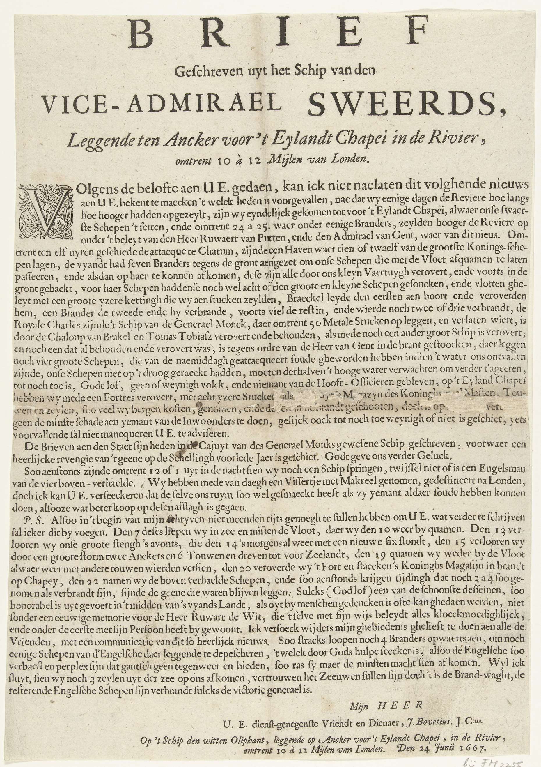 Brief geschreven aan boord van het schip de Witten Oliphant van vice-admiraal Isaac Sweers, liggend voor anker bij het eiland Sheppey, waarin verslag wordt gedaan van de overwinningen tijdens de Tocht naar Chatham, opgesteld op 24 juni 1667.