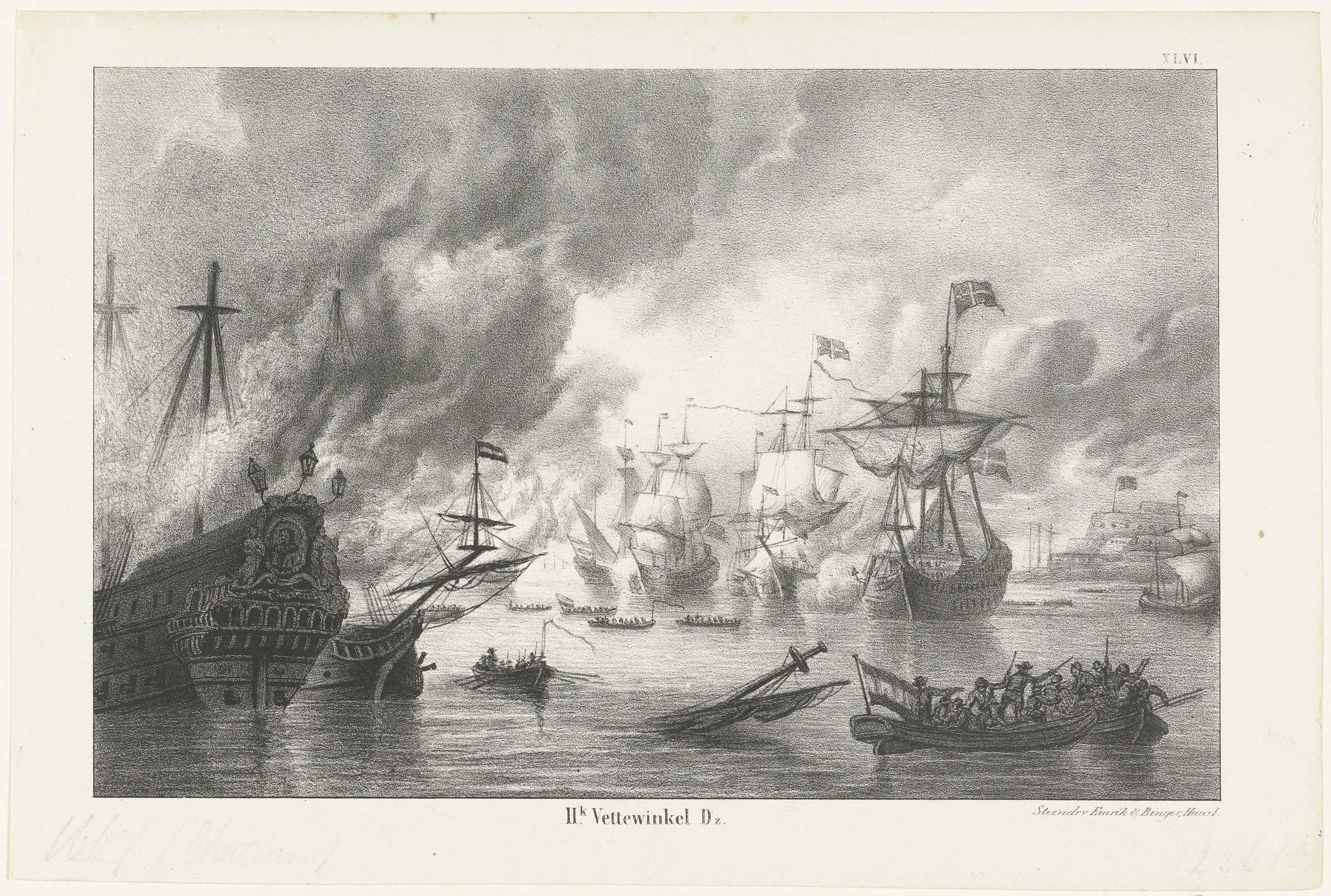 De vernietiging van de Engelse vloot bij Chatham, 22 juni 1667. Episode uit de Tocht naar Chatham op 20-23 juni 1667 door de Staatse vloot onder De Ruyter. Genummerd rechtsboven: XLVI.