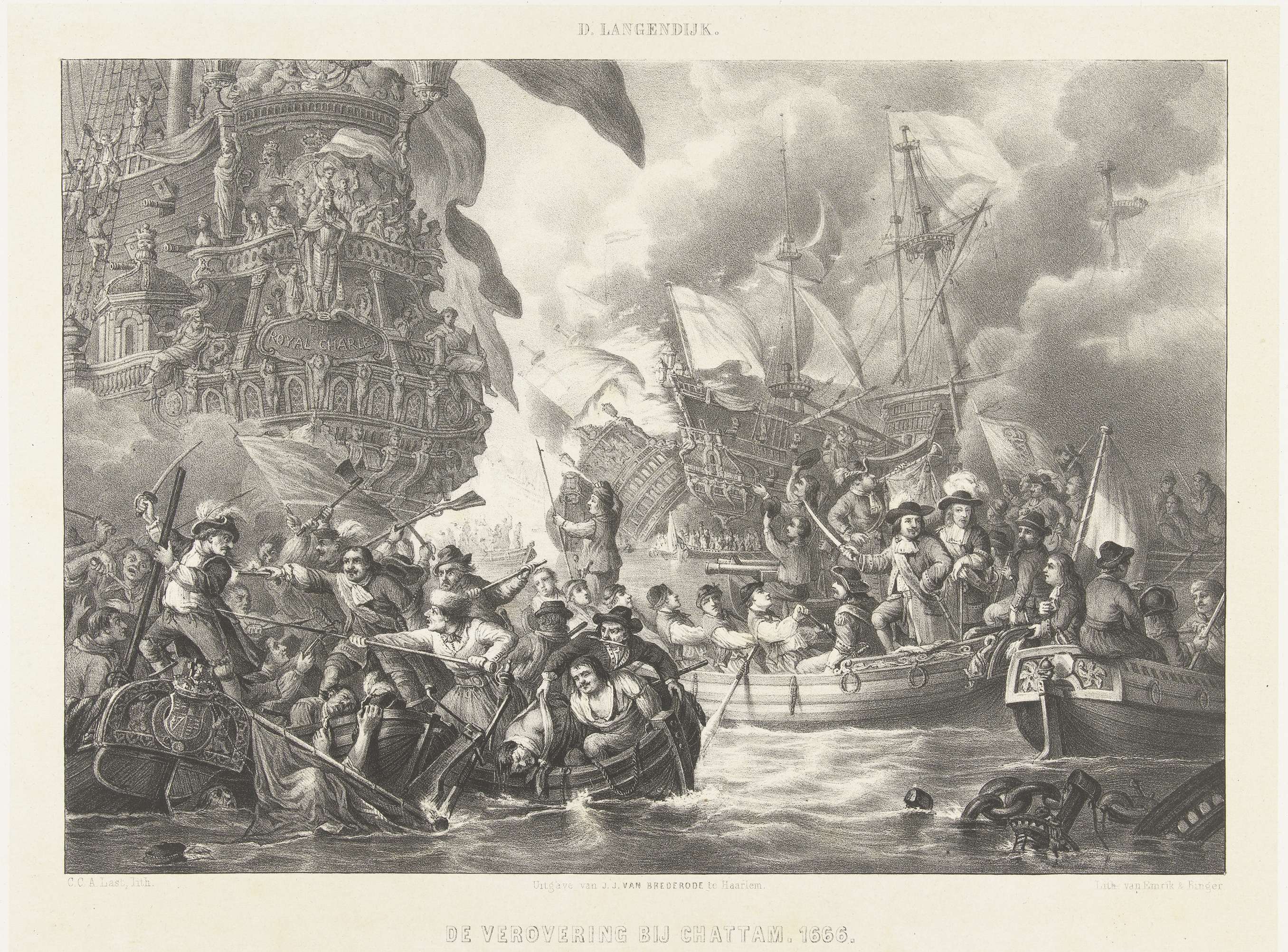 Man-tot-man-gevechten in sloepen, op de achtergrond de vernietiging van de Engelse vloot bij Chatham, links de verovering van het Engelse vlaggeschip de Royal Charles op 22 juni 1667. Centraal in een sloep staan Cornelis de Witt en Michiel Adriaenszoon de Ruyter, links kapitein Jan van Brakel schietend met zijn pistool. Op de voorgrond de doorgevaren ...