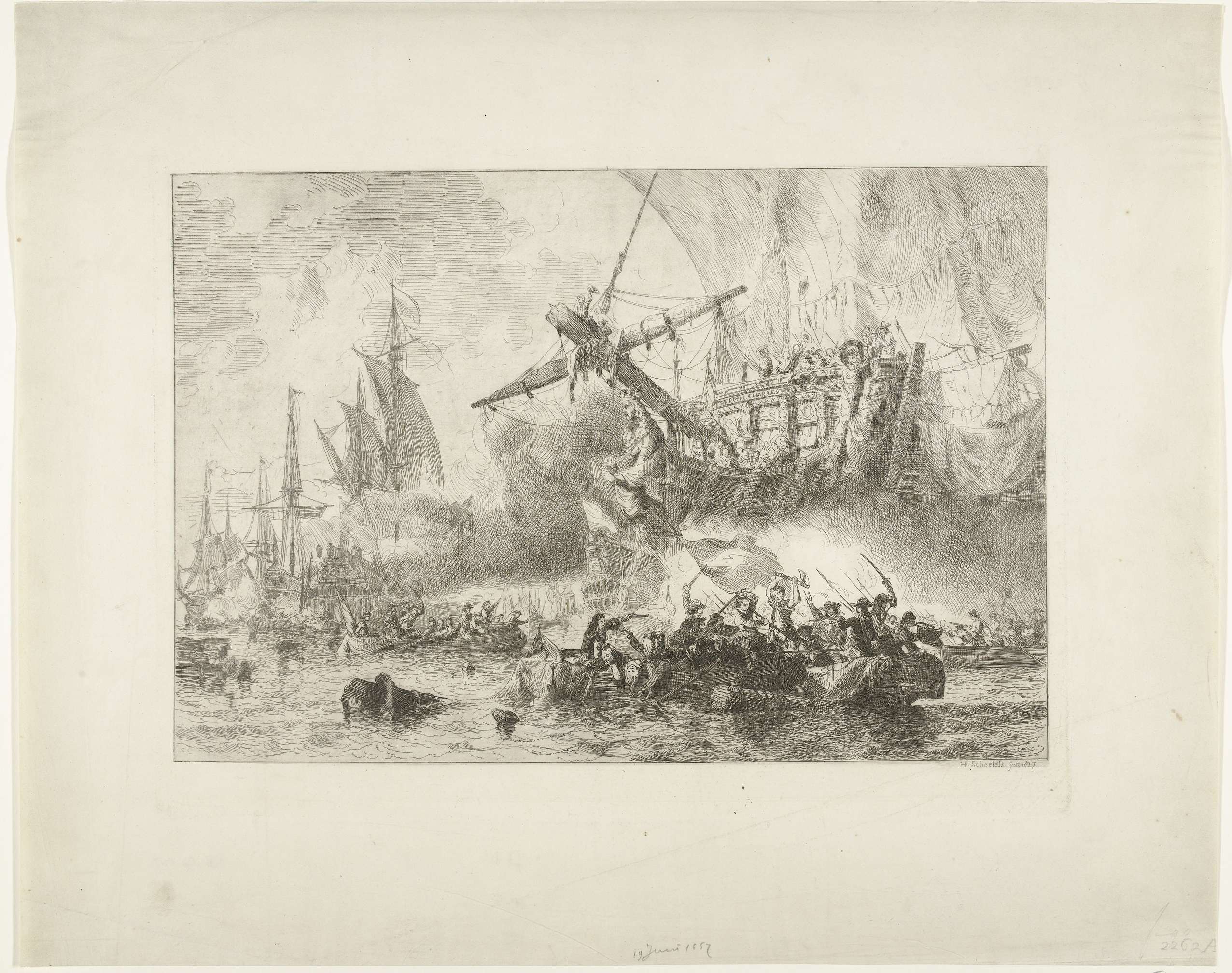 De vernietiging van de Engelse vloot bij Chatham door de Staatse vloot onder admiraal Michiel Adriaenszoon de Ruyter, rechts de verovering van het Engelse vlaggeschip de Royal Charles op 22 juni 1667. Op de voorgrond woeste man-tot-man-gevechten in sloepen.