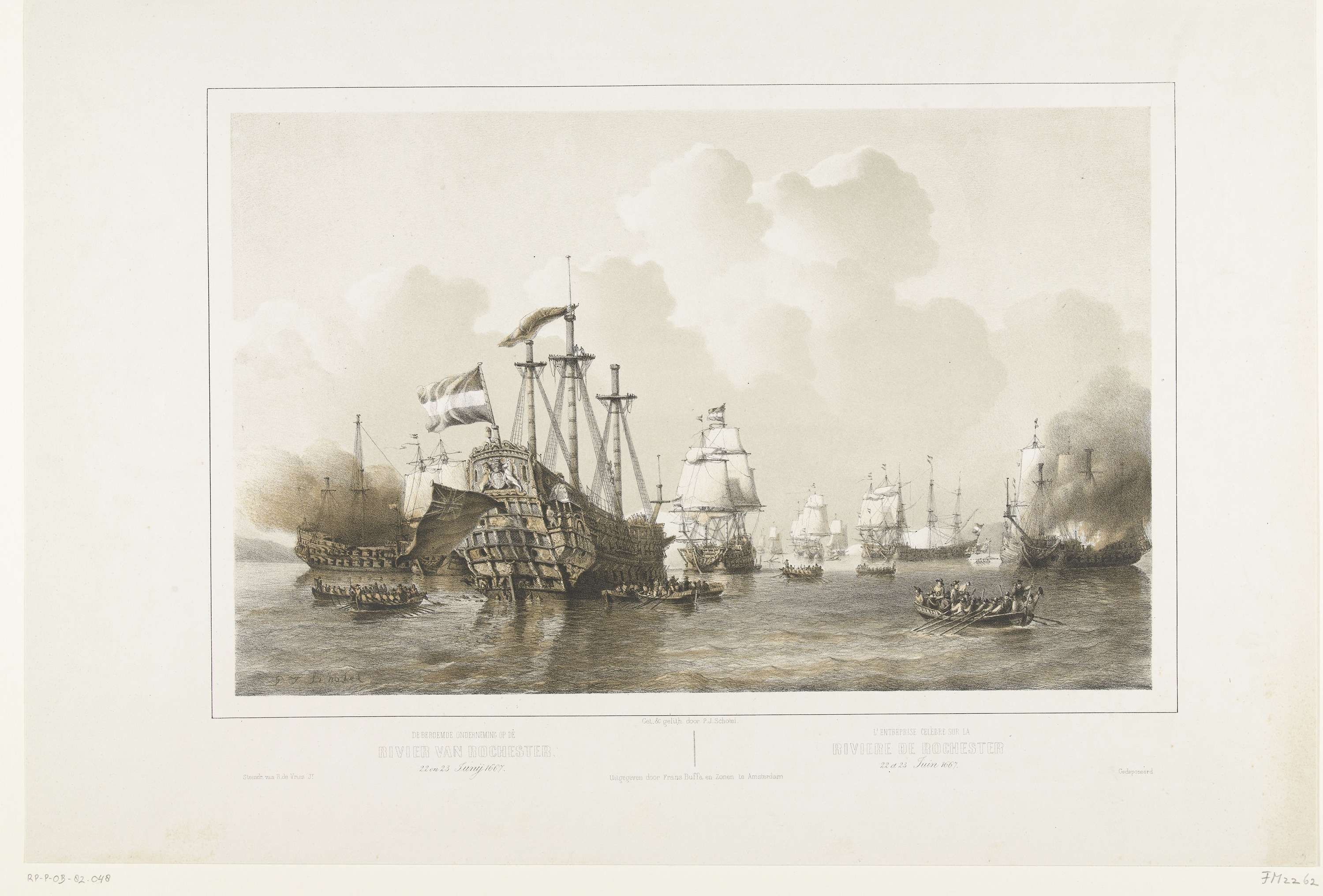 De vernietiging van de Engelse vloot bij Chatham door de Staatse vloot onder admiraal Michiel Adriaenszoon de Ruyter, links de verovering van het Engelse vlaggeschip de Royal Charles op 22 juni 1667.