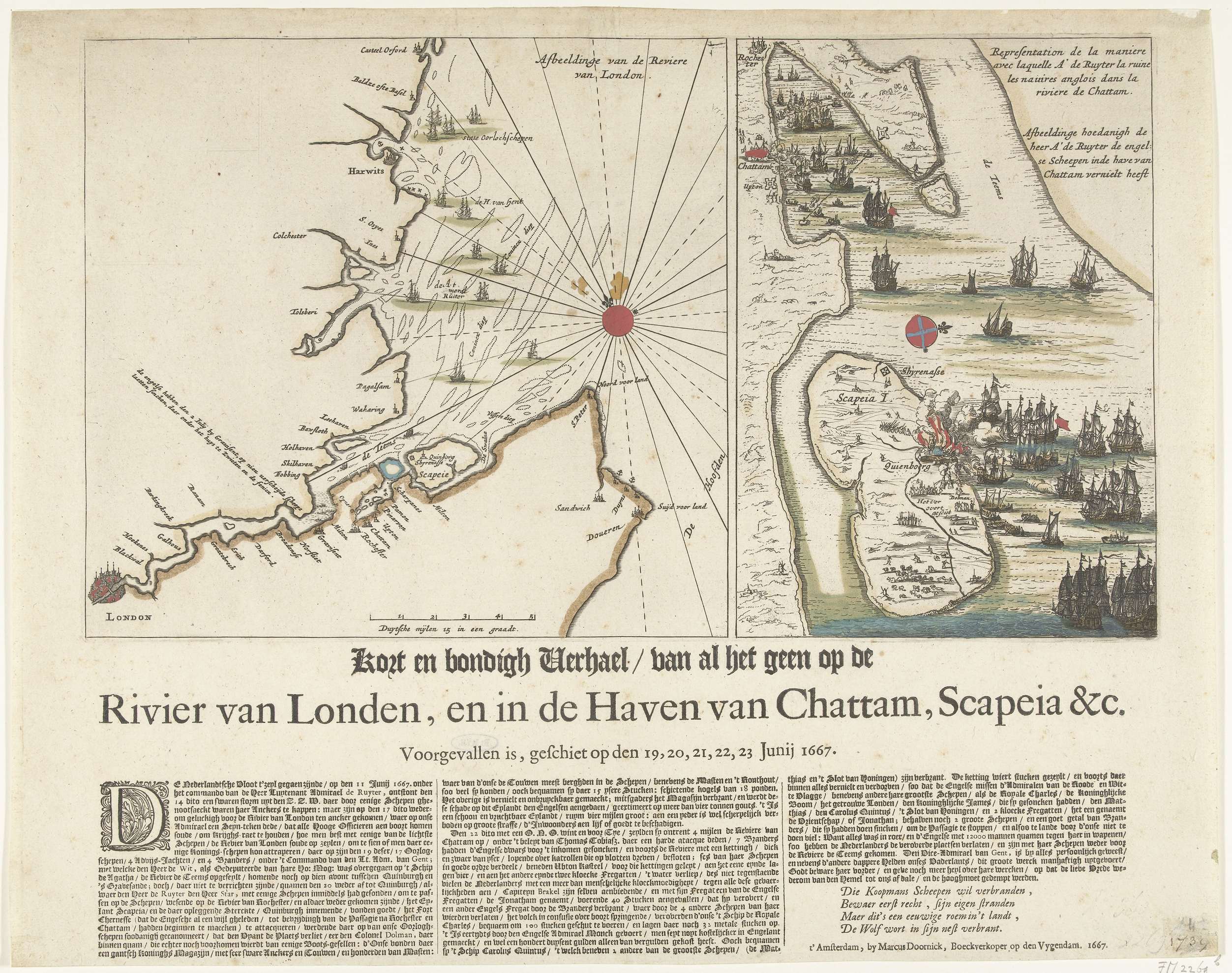 Blad met twee voorstellingen over de Tocht naar Chatham op 20-23 juni 1667 door de Staatse vloot onder admiraal Michiel Adriaenszoon de Ruyter. Links een kaart van de Engelse oostkust en de monding van de Theems. Rechts de Nederlandse schepen op de Theems en Medway en de gevechten bij het eiland Sheppey en de plaatsen ...