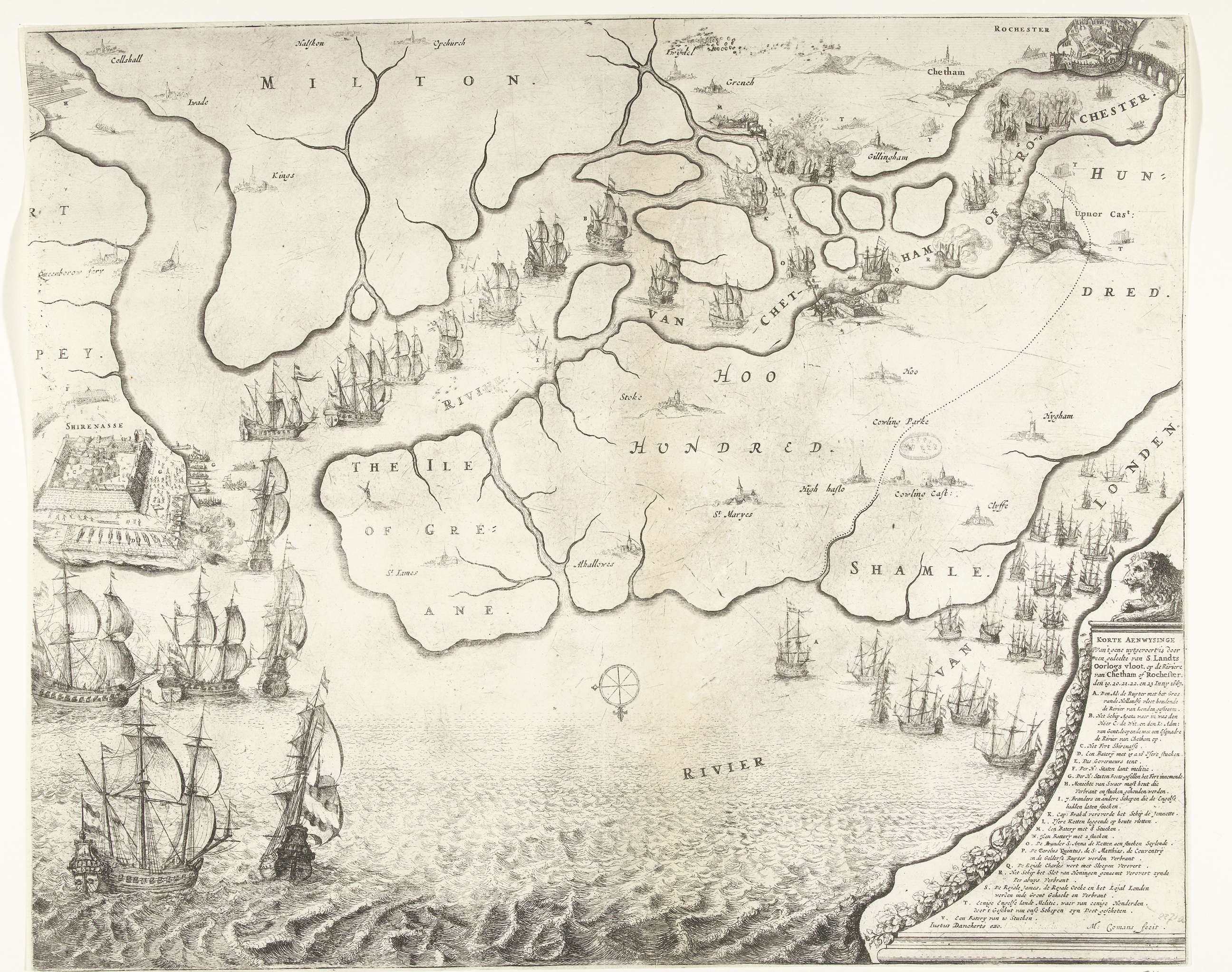 Kaart van de monding van de Theems waarop de Tocht naar Chatham door de schepen van de Staatse vloot onder admiraal Michiel Adriaenszoon de Ruyter is aangegeven, 20-23 juni 1667. Links de strijd rond Sheerness, boven de Nederlandse schepen op de rivier de Medway. Rechtsonder een leeuw op een voetstuk waarop de legenda A-V.