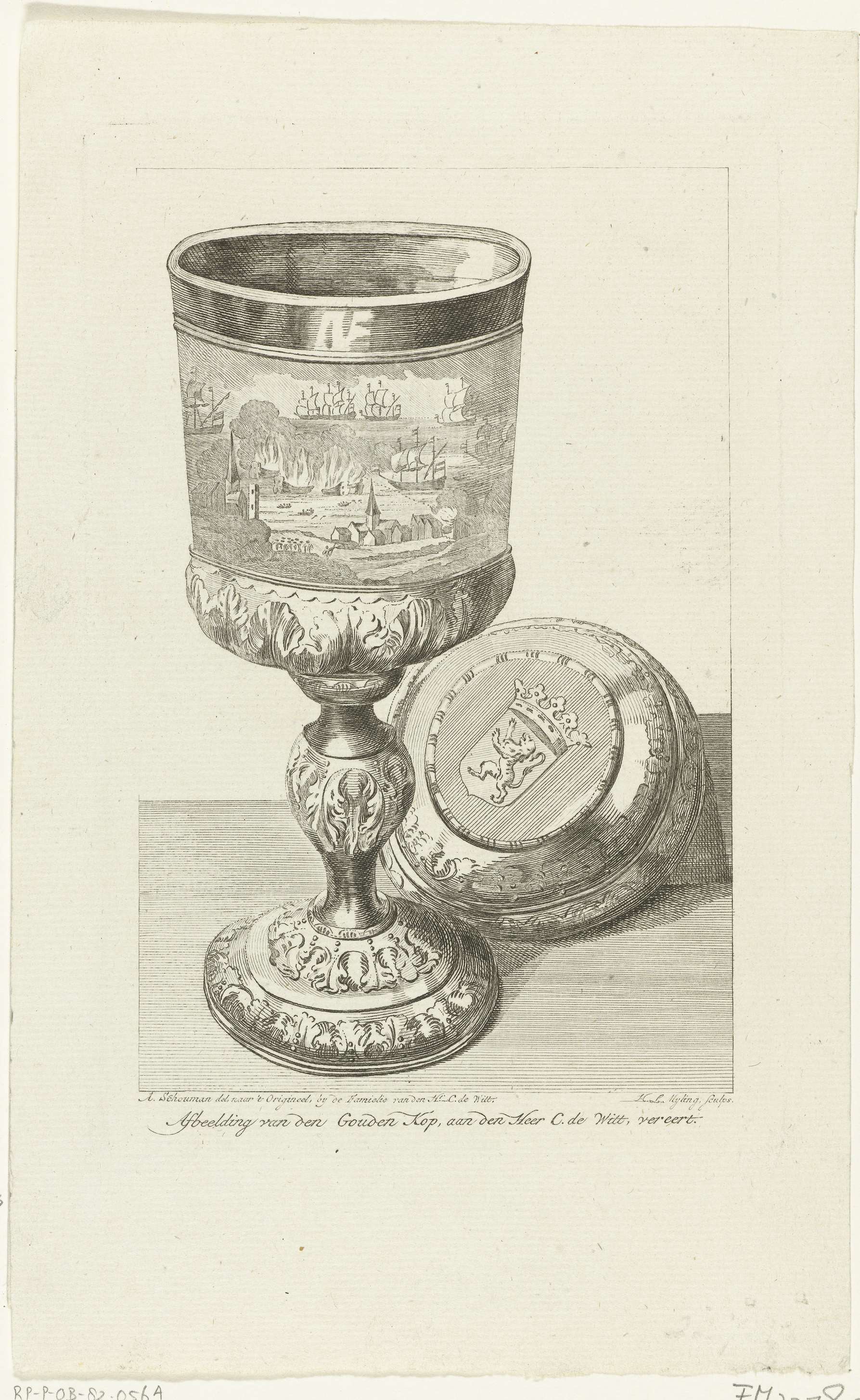 Een gouden beker met losse deksel, geschonken door de Staten van Holland en West-Friesland aan Cornelis de Witt ter gelegenheid van de overwinning op de Engelsen tijdens de Tocht naar Chatham, 20-23 juni 1667. Op de beker een voorstelling van de Tocht naar Chatham. De beker bevond zich destijds in familiebezit. Bij de prent zijn ...