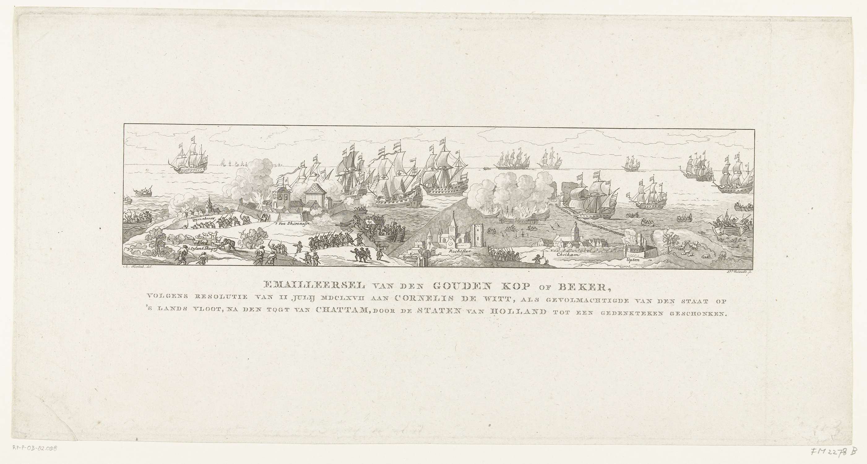 Geëmailleerde voorstelling van de Tocht naar Chatham en de strijd rond Sheerness, op de gouden beker geschonken door de Staten van Holland en West-Friesland aan Cornelis de Witt ter gelegenheid van de overwinning op de Engelsen tijdens de Tocht naar Chatham, 20-23 juni 1667.