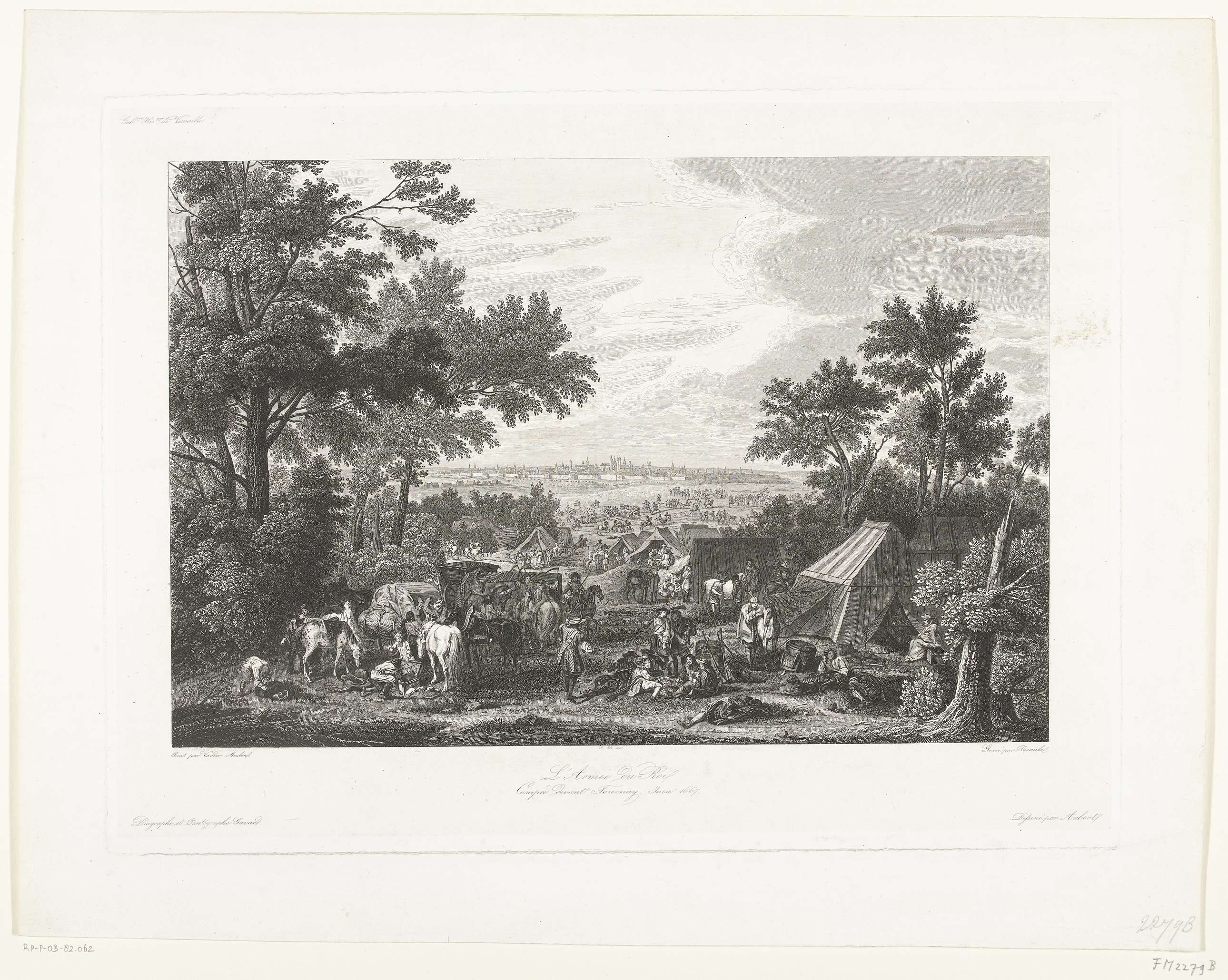 Het Franse leger van Lodewijk XIV gelegerd voor Tournai (Doornik), juni 1667. Gezicht in het Franse legerkamp met bivakkerende soldaten in tenten, in de verte het profiel van de stad.