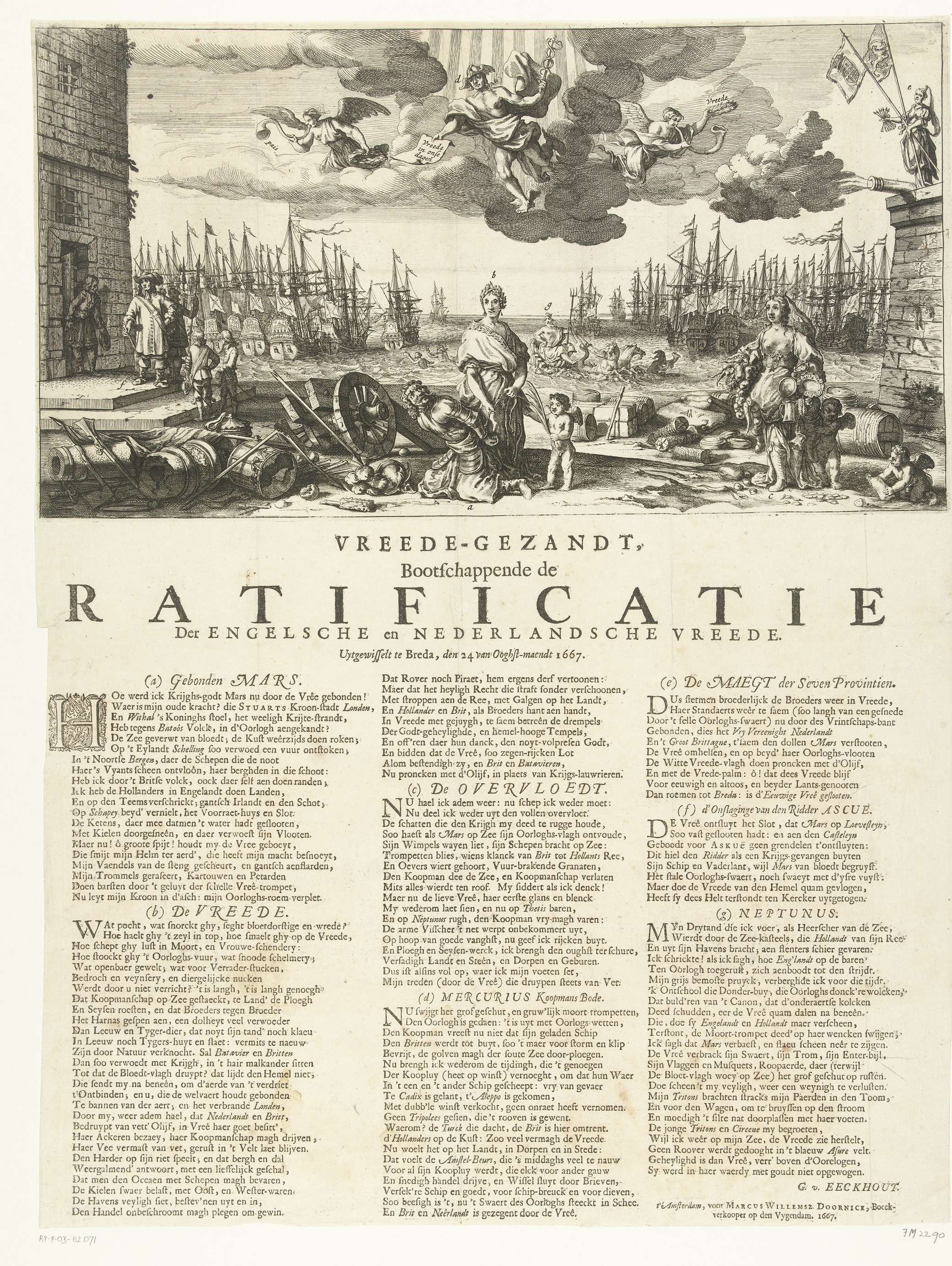 Allegorie op de ratificatie van de Vrede te Breda op 24 augustus 1667. Centraal de Vrede die Mars geketend houdt, rechts de Overvloed. Rechts staande op een muur de Hollandse Maagd. Links de vrijlating van admiraal Ayscue uit slot Loevestein. Op de achtergrond Neptunus op het water tussen de Engelse en de Staatse vloten. In ...