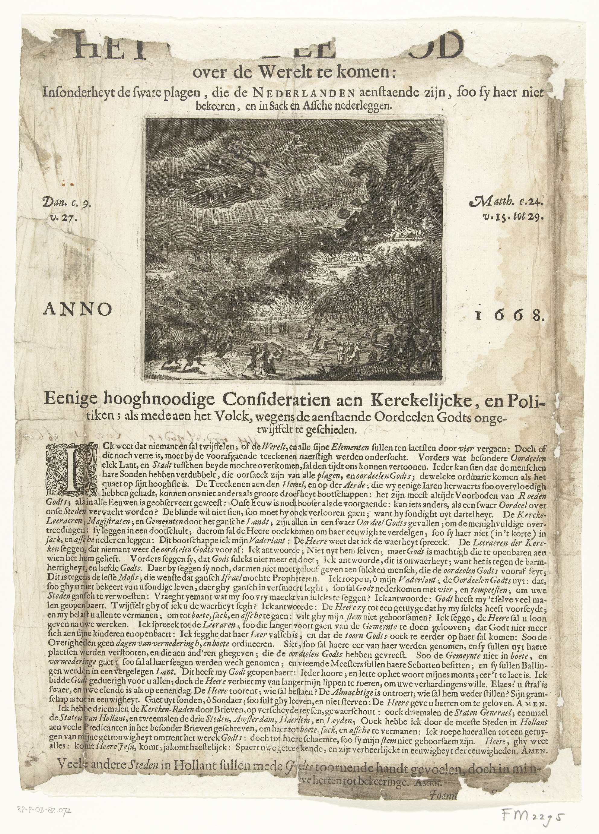 Waarschuwing over de aanstaande bestraffing van het land door God, 1668. Blad met een prent van de plagen die de Nederlanden zullen treffen: vuur vanuit de hemel, brandende steden, stormen die overstromingen brengen en bomen afbreken. Bergen vallen om, walvis op zee, dansend duivels met fakkels, in de wolken blaast een engel op een bazuin. ...