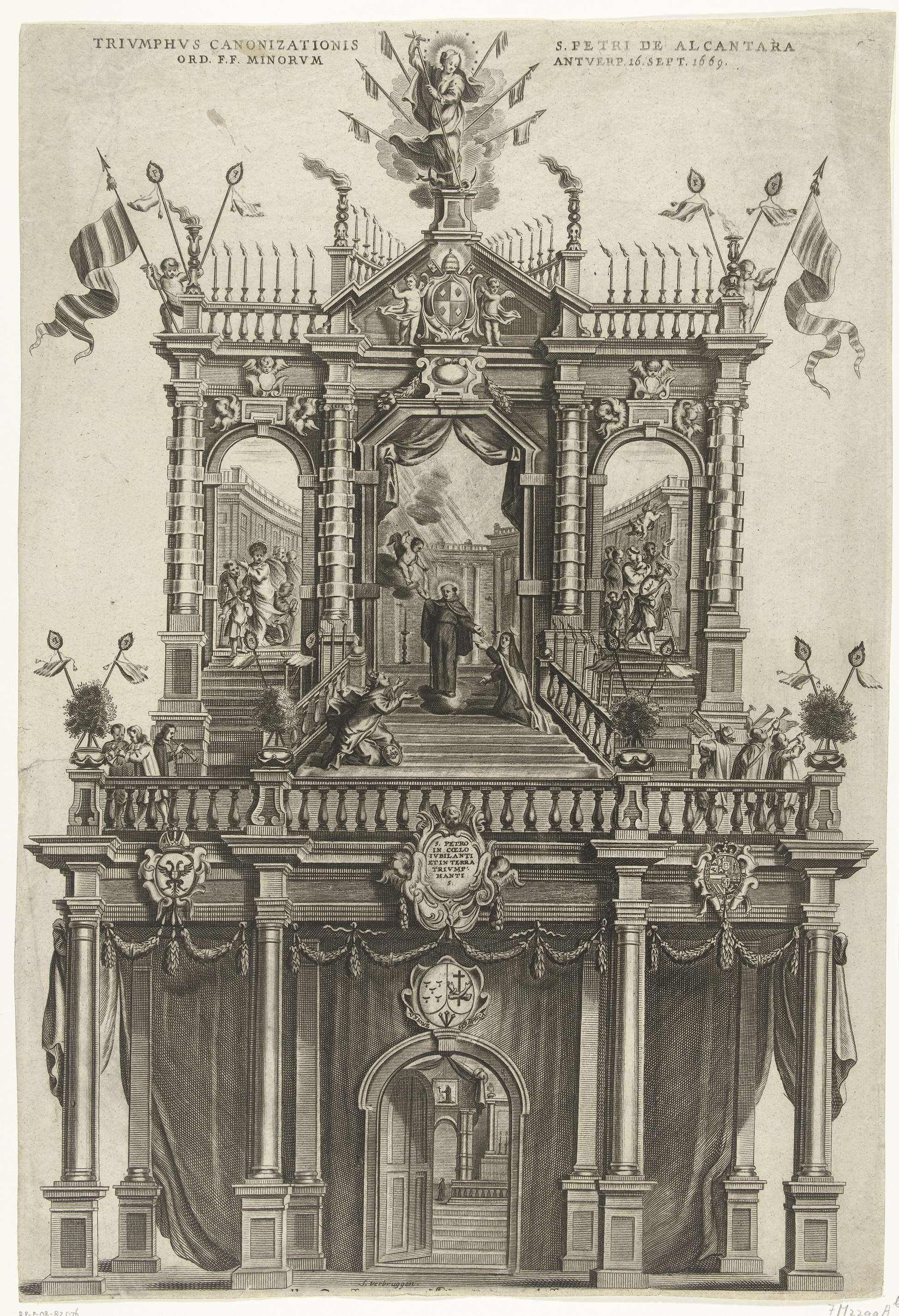 Triomfpoort opgericht te Antwerpen ter gelegenheid van de heiligverklaring van Petrus van Alcantara op 16 september 1669. Centraal de heilige met de Heilige Theresia van Avila. Geheel versierd met vaandels, kaarsen en putti. Onderaan een doorkijk door een open deur in een kerk.