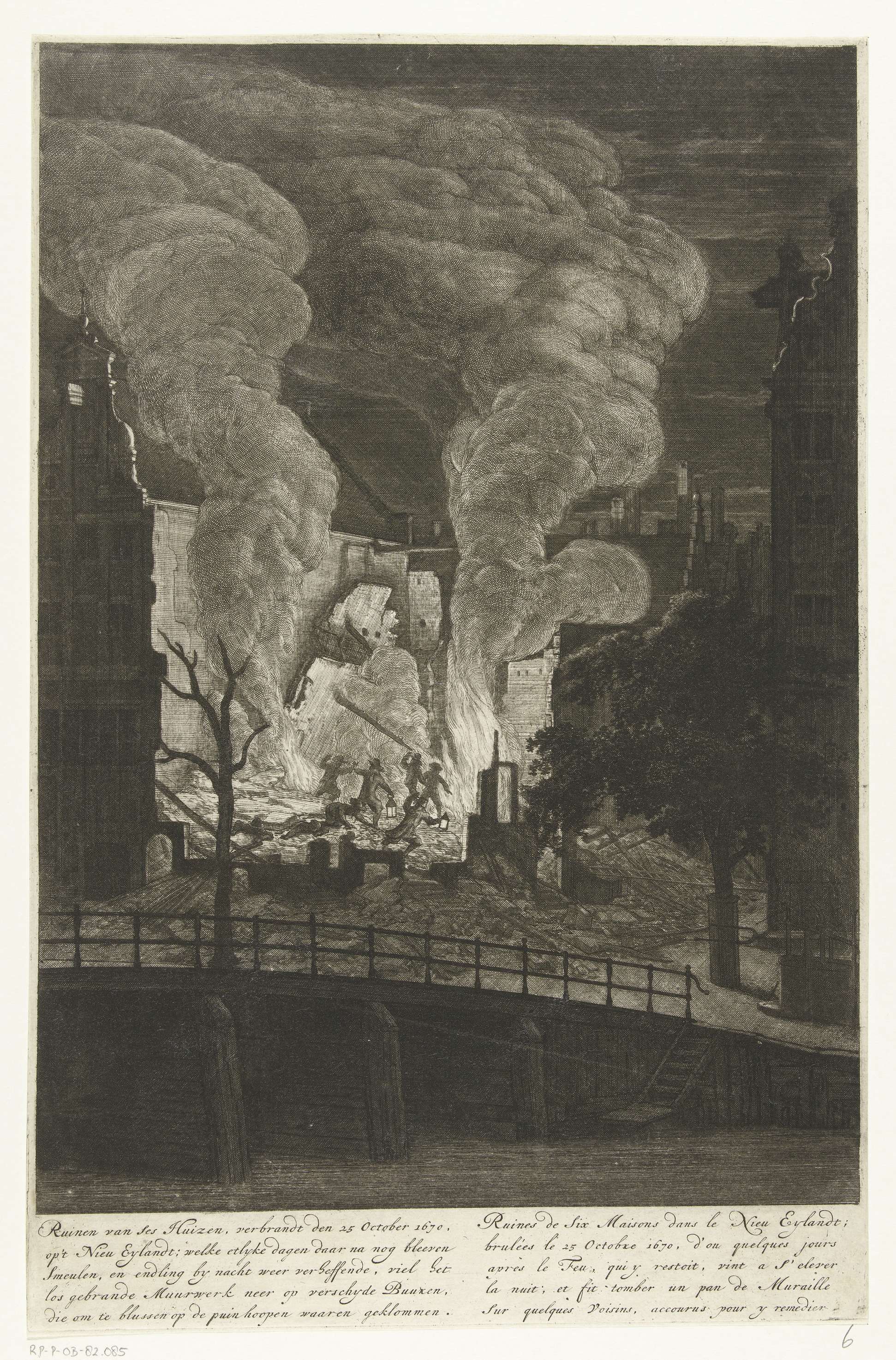 De nog brandende ruïnes van zes huizen bij de brand van 25 oktober 1670 aan de Binnenkant bij de hoek van de Buiten Bantammerstraat op het Waalseiland (ook bekend als het Nieuwe Eiland) te Amsterdam. Met vijfregelig onderschrift in het Nederlands en Frans. Plaat 6 in het Brandspuitenboek van Jan van der Heyden.