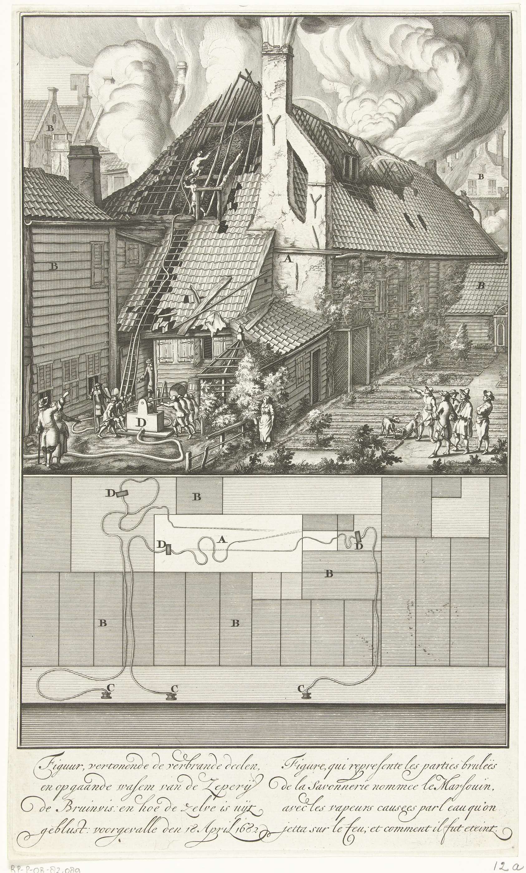 De gebluste brand in de zeepziederij De Bruinvis aan het einde van de Looiersgracht te Amsterdam, op 18 april 1682. Uit het gebouw komen wolken waterdamp, veroorzaakt door het blussen. Onderaan een plattegrond van de plaatsing van de pompen en slangen. Met vierregelig onderschrift in het Nederlands en Frans. Plaat 12 in het Brandspuitenboek van ...
