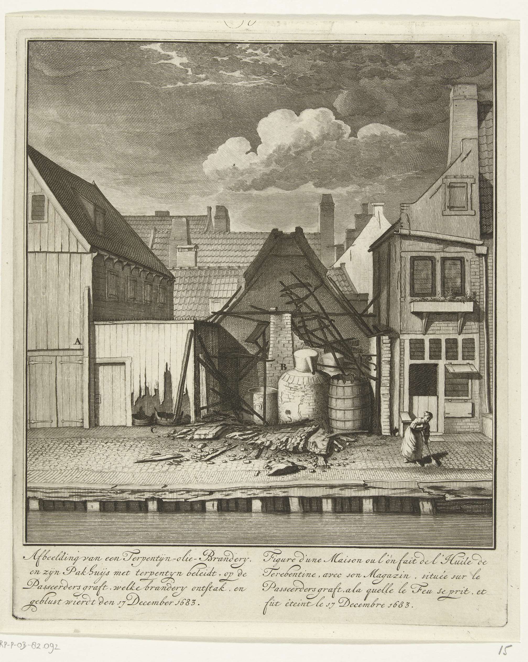 Ruïne van een op 17 december 1683 half afgebrande terpentijnoliebranderij op de Passeerdersgracht te Amsterdam. Met vierregelig onderschrift in het Nederlands en Frans. Plaat 15 in het Brandspuitenboek van Jan van der Heyden.